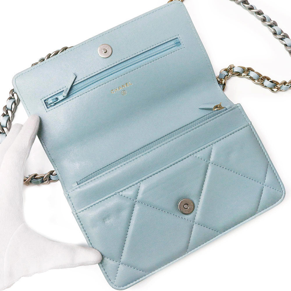 【未使用 展示品】CHANEL シャネル AP0957 19 ナインティーン ココマーク マトラッセ ラムスキン ライトブルー 2WAY チェーンウォレット 斜め掛け 財布 レザー アンティークゴールド アンティークシルバー金具