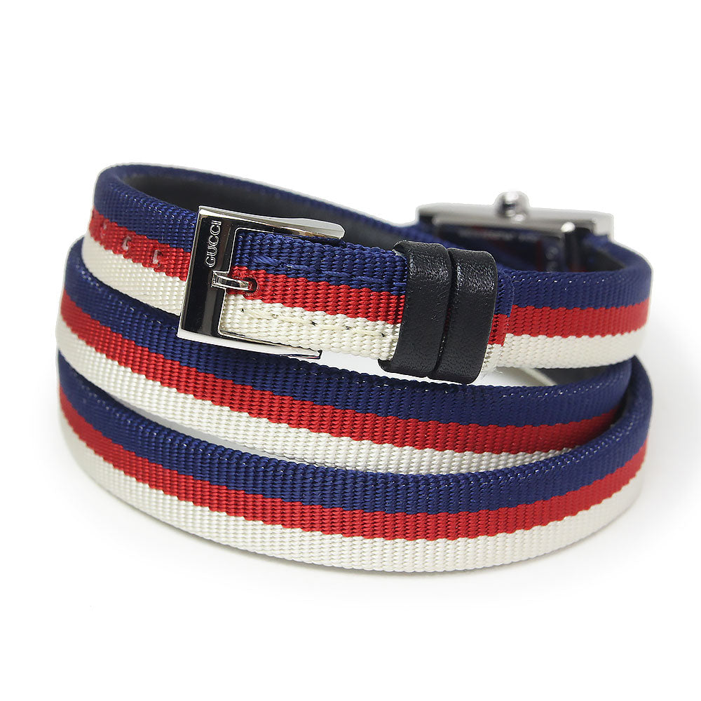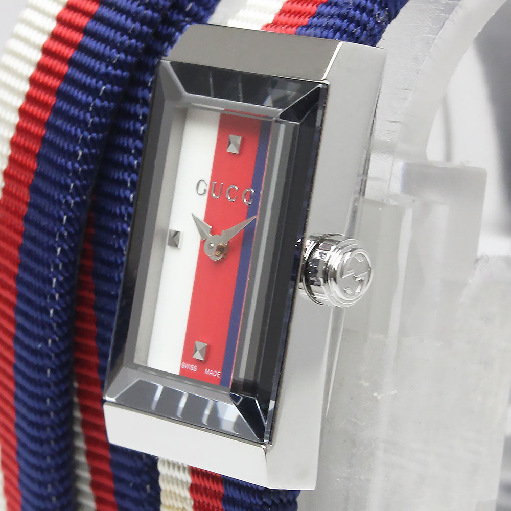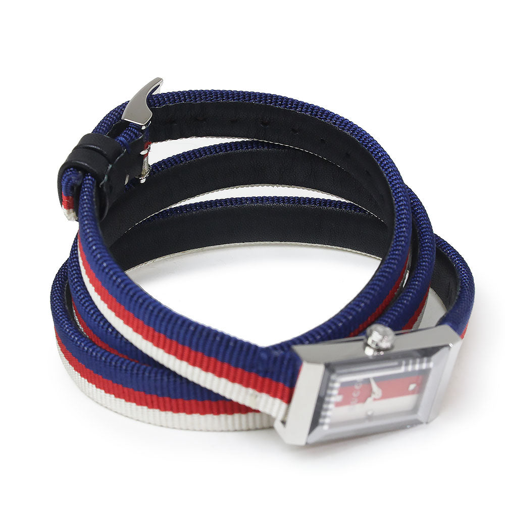 3重巻きベルトのお洒落なグッチ腕時計『Gフレーム』トリプルループで楽しめるトリコロールカラーの長いベルトを組み合わせたこのモデルは、ベルトと一体感を図ったダイヤルデザインも魅力。表面に丈夫なテキスタイルナイロン素材、裏面にブラックレザーが採用されたベルトは着け心地に優れ、インパクトあるデザインにもグッチのクラス感を香らせて手元をファッショナブルに彩ります。 |