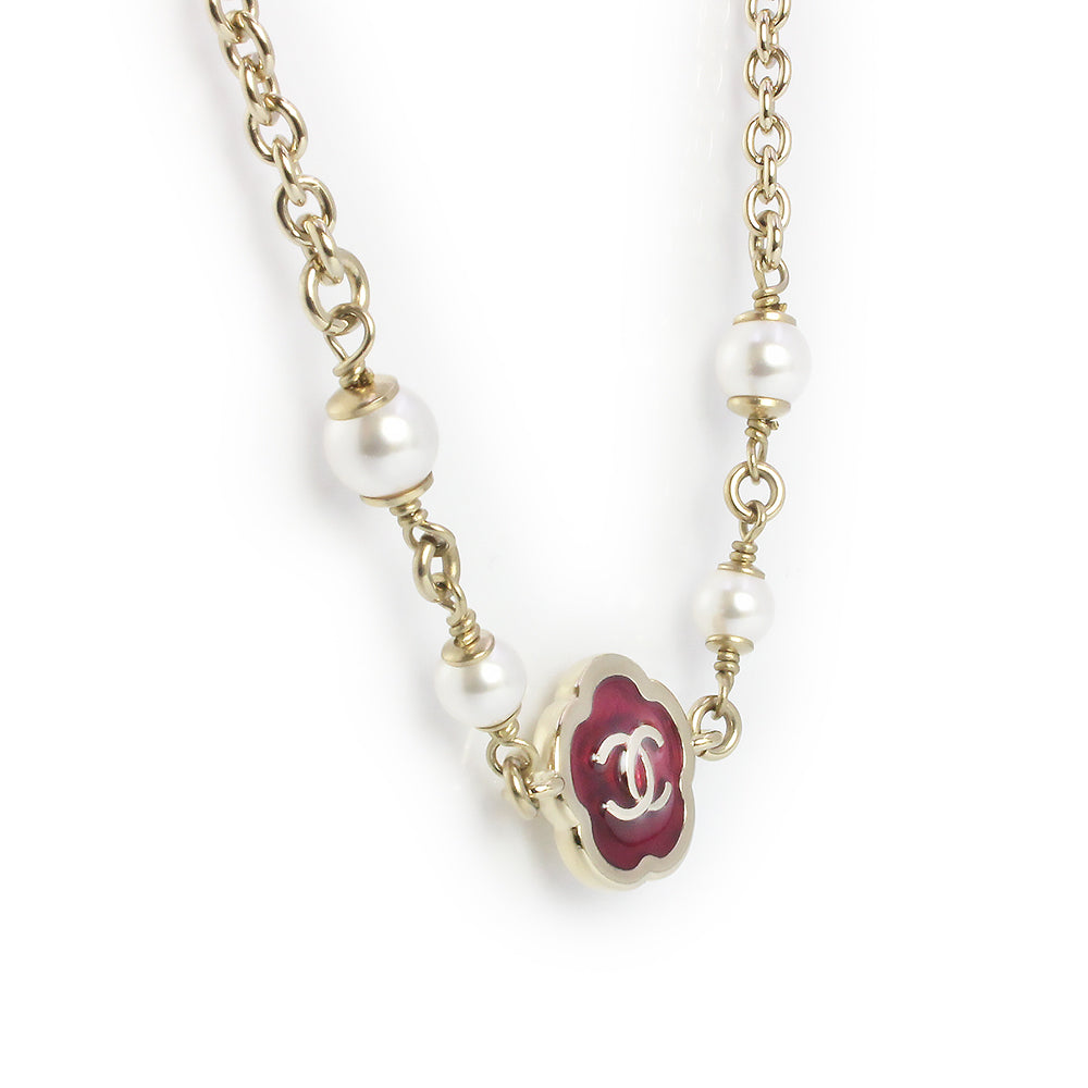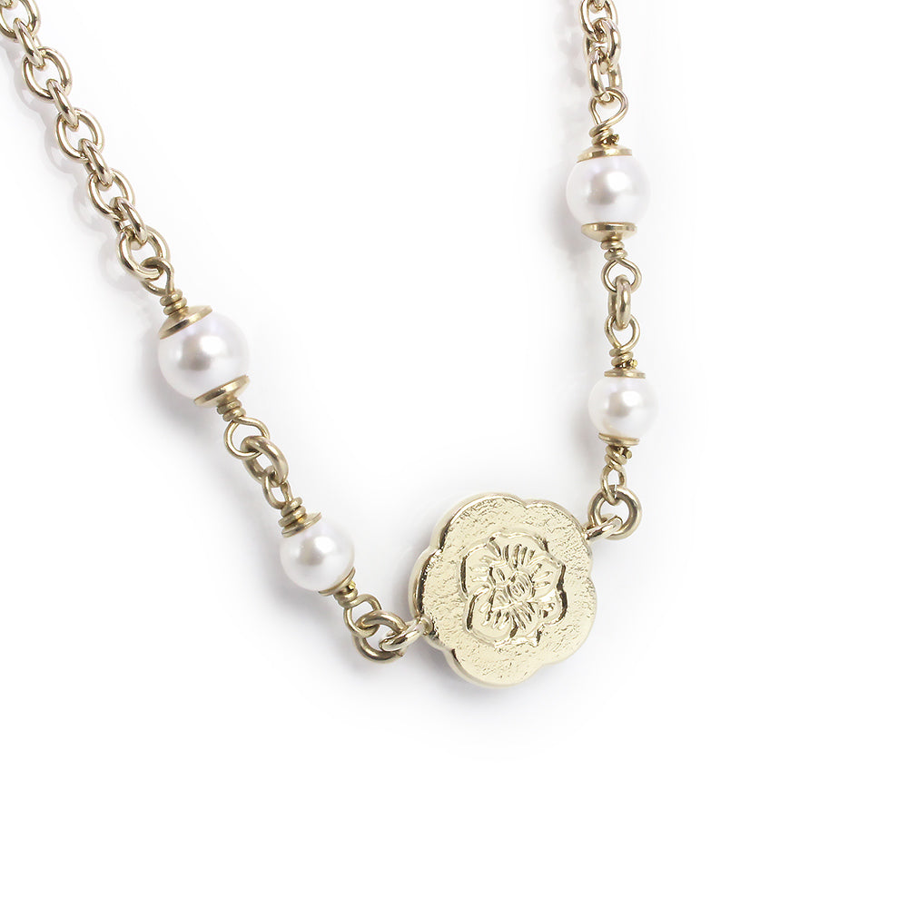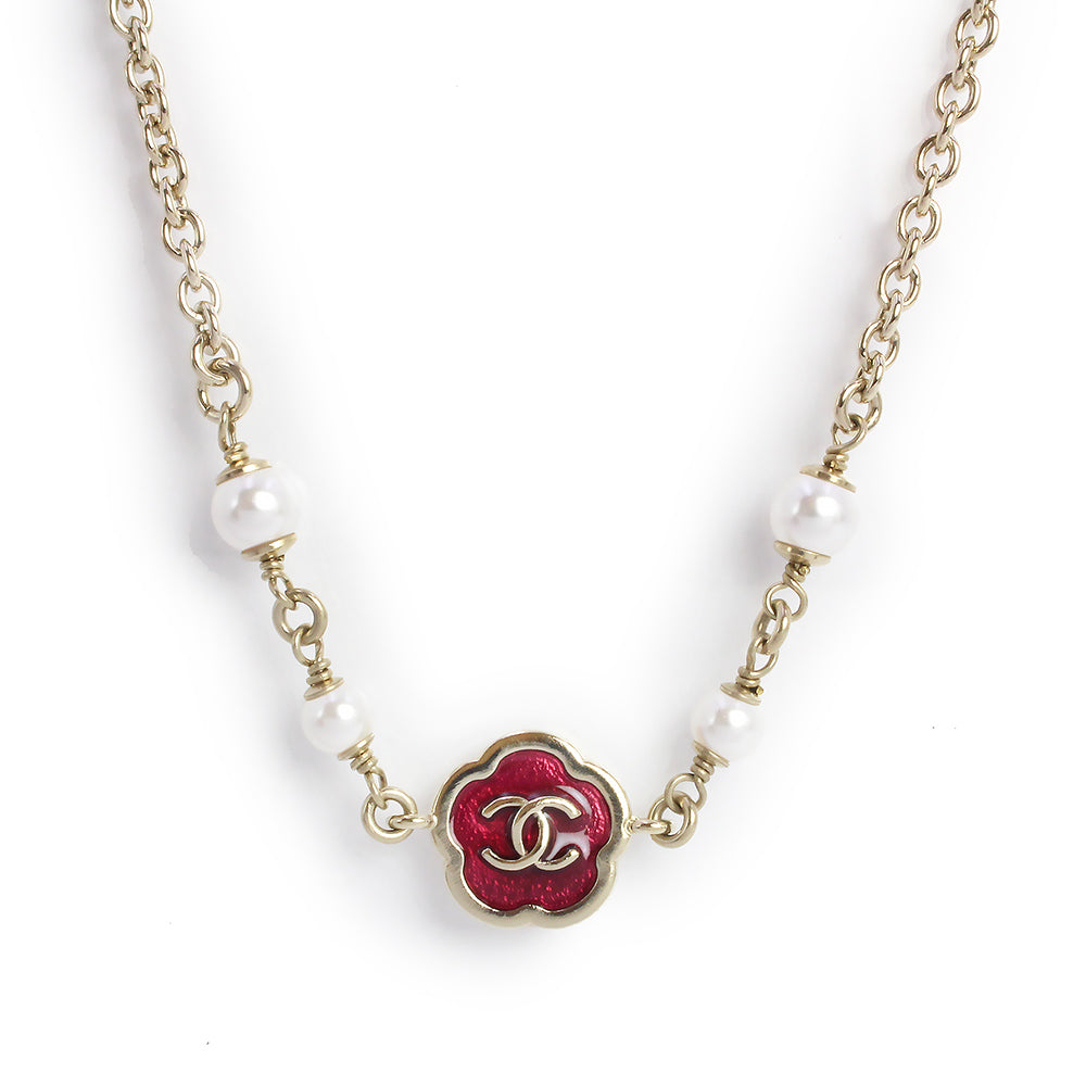 领口处饰有带有CC标志和珍珠的花朵图案。它可以用于多种场合,例如作为服装的焦点,或为您的装扮增添一丝魅力。