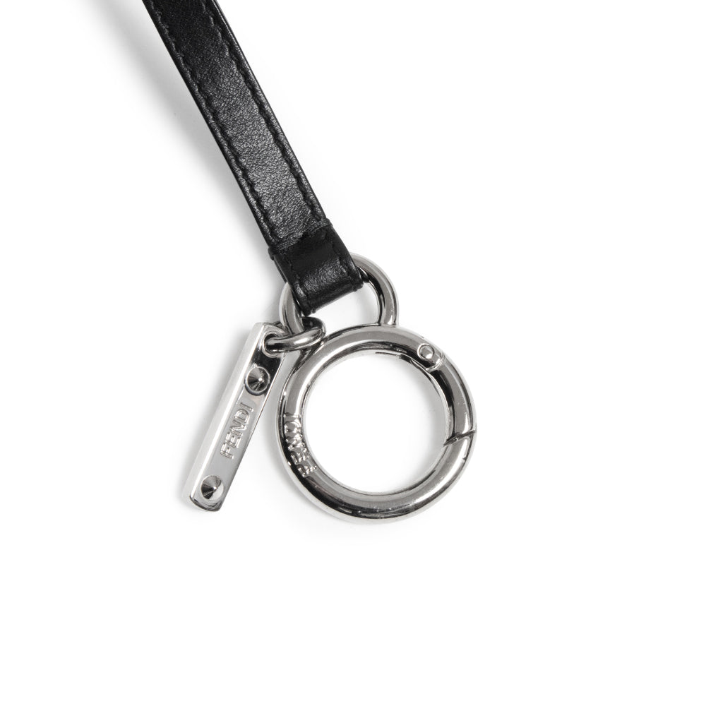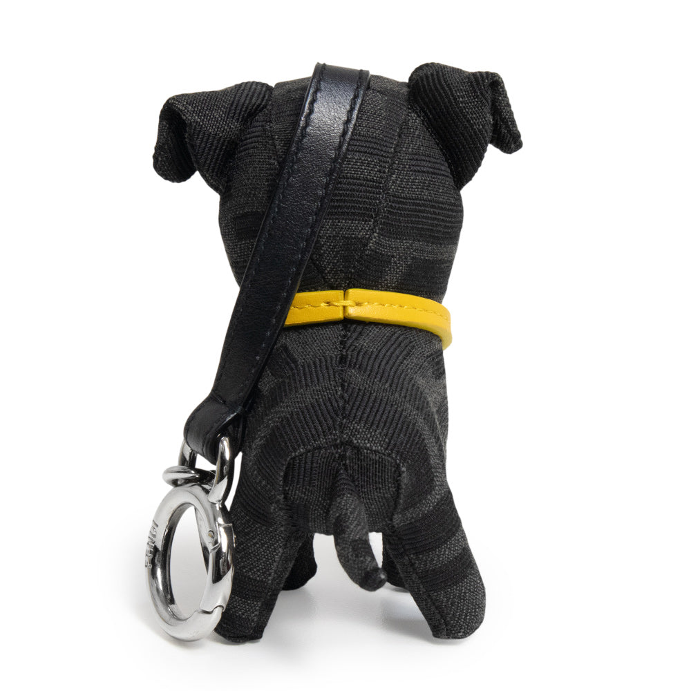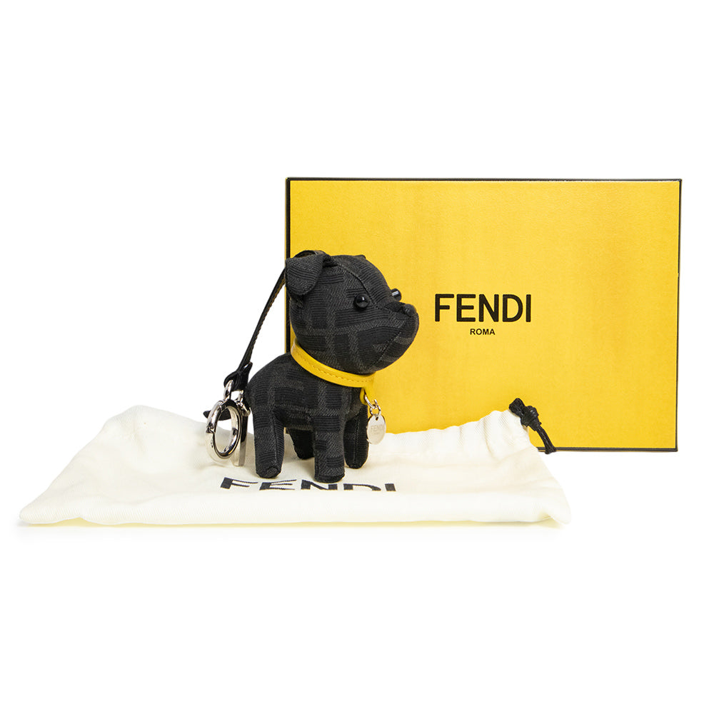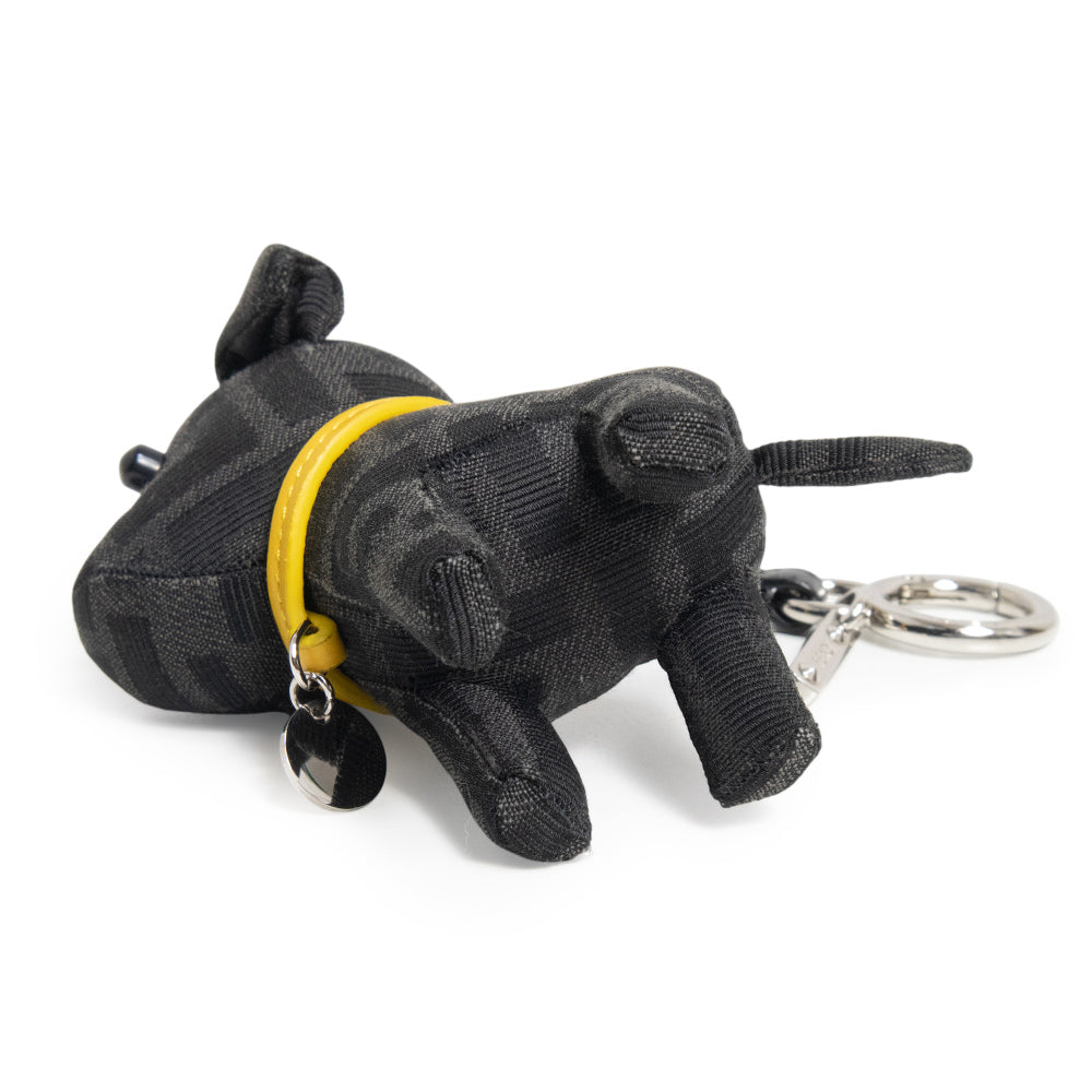 这款黑色FF提花包饰造型为小狗,灵感源自创意总监Silvia Fendi的爱犬ITO。配有黄色皮革项圈和品牌标识吊牌。