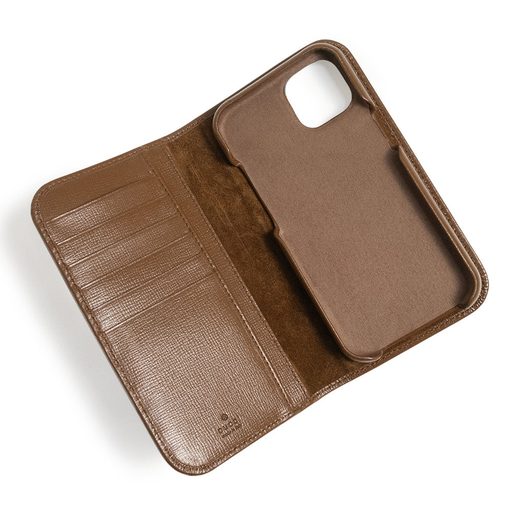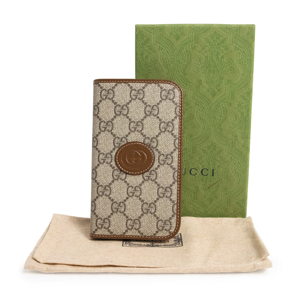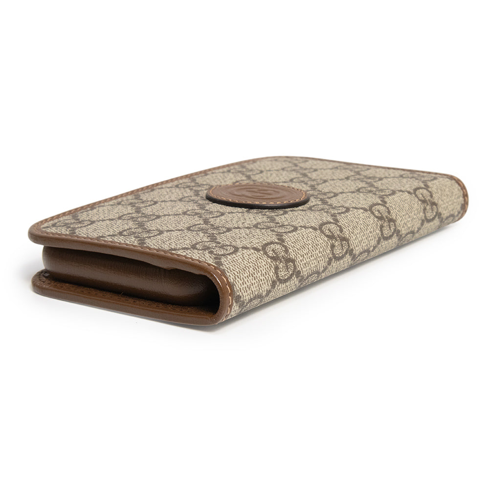 这款 Gucci 钱包式 iPhone 15 手机壳采用时尚的 GG Supreme 帆布搭配皮革饰边和卡槽,兼具保护性和实用性。