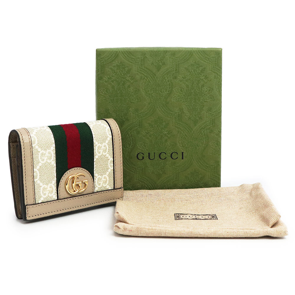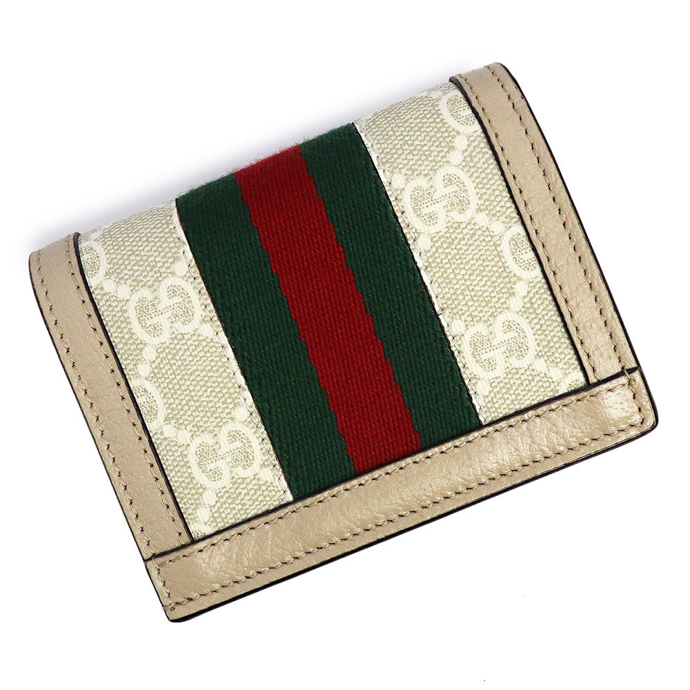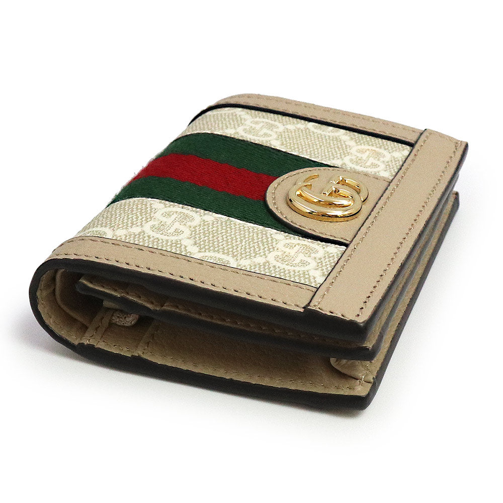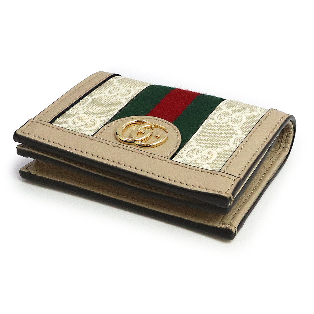 [未使用展示品] Gucci Ophidia GG 卡片夹,紧凑型双折钱包,GG 高级帆布和小牛皮,米白色配金色五金配件,523155,带盒子