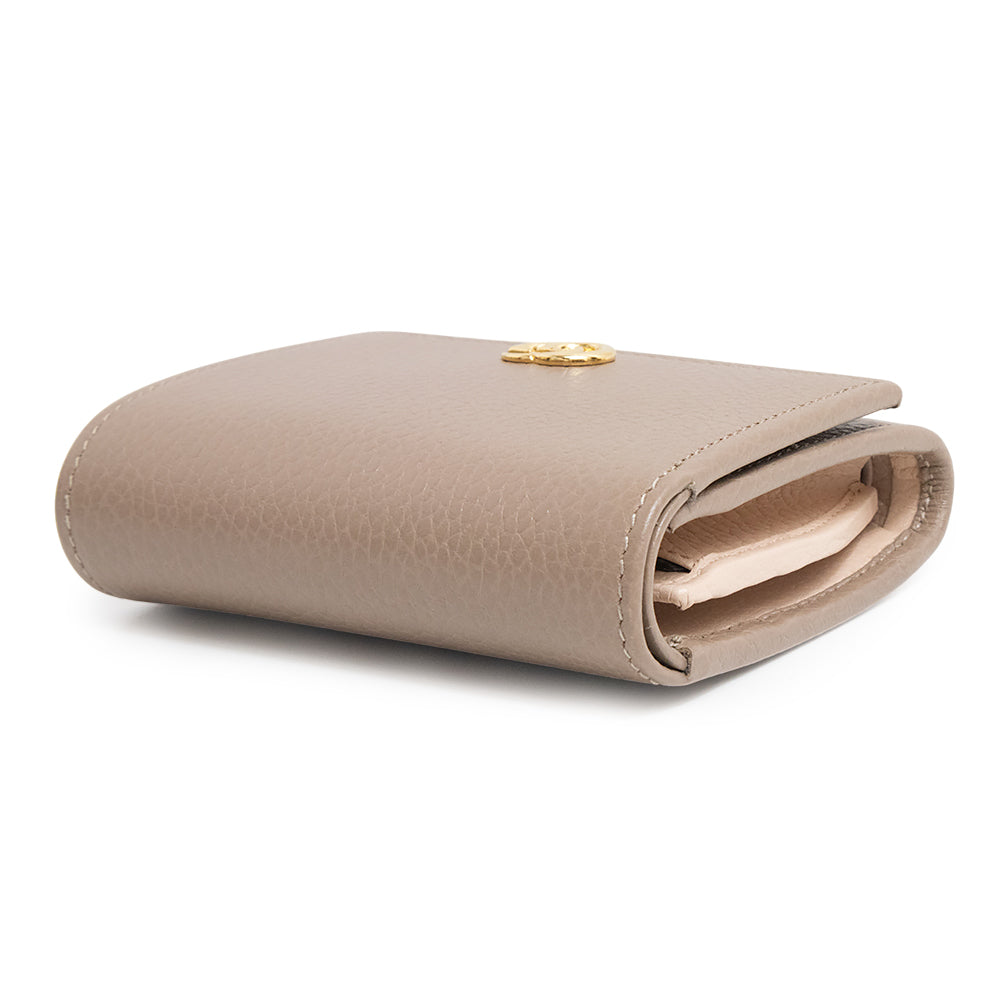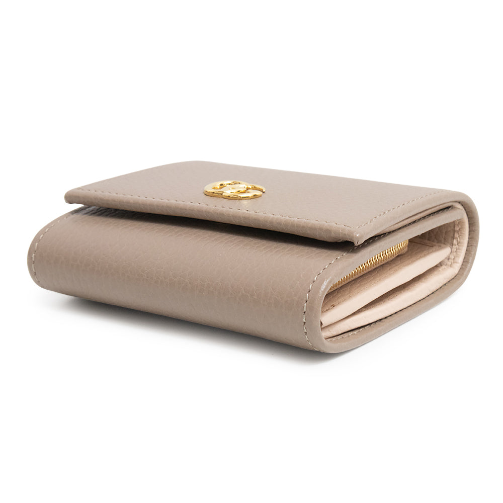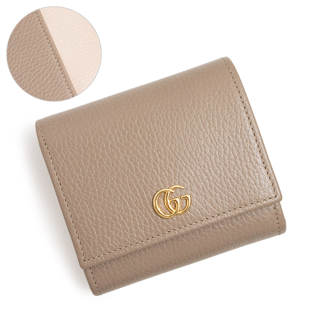 双G双色小号钱包采用光滑皮革制成,外层为灰褐色,内层为浅粉色。这款小巧的钱包设有多个内部隔层。