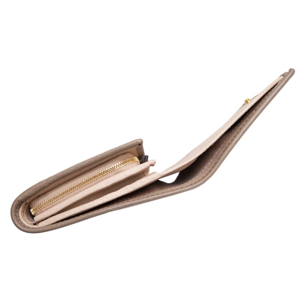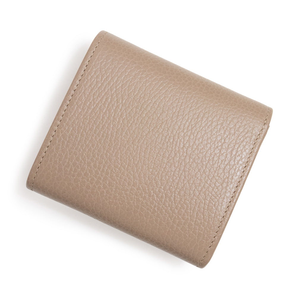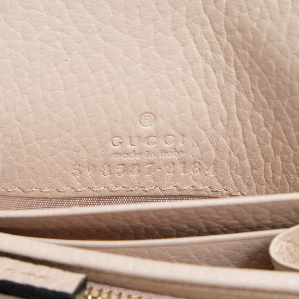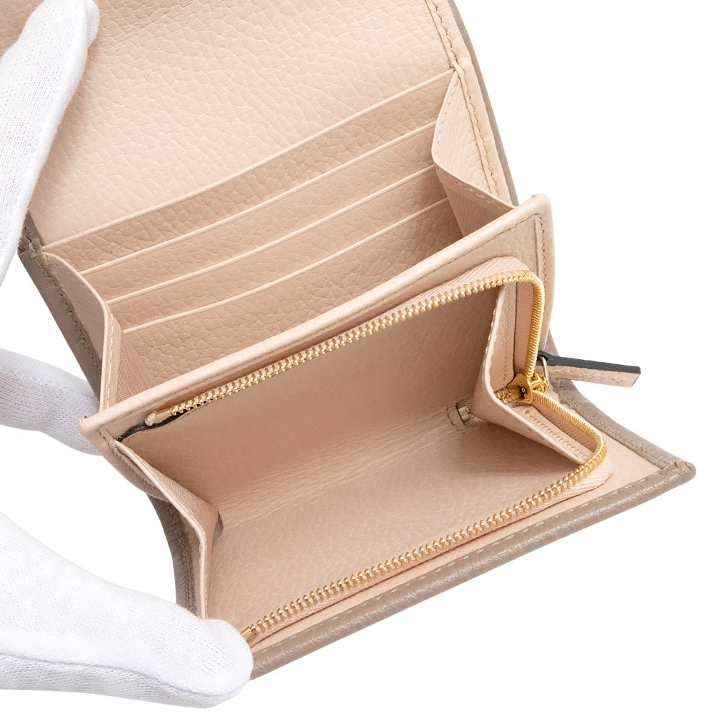 双G双色小号钱包采用光滑皮革制成,外层为灰褐色,内层为浅粉色。这款小巧的钱包设有多个内部隔层。