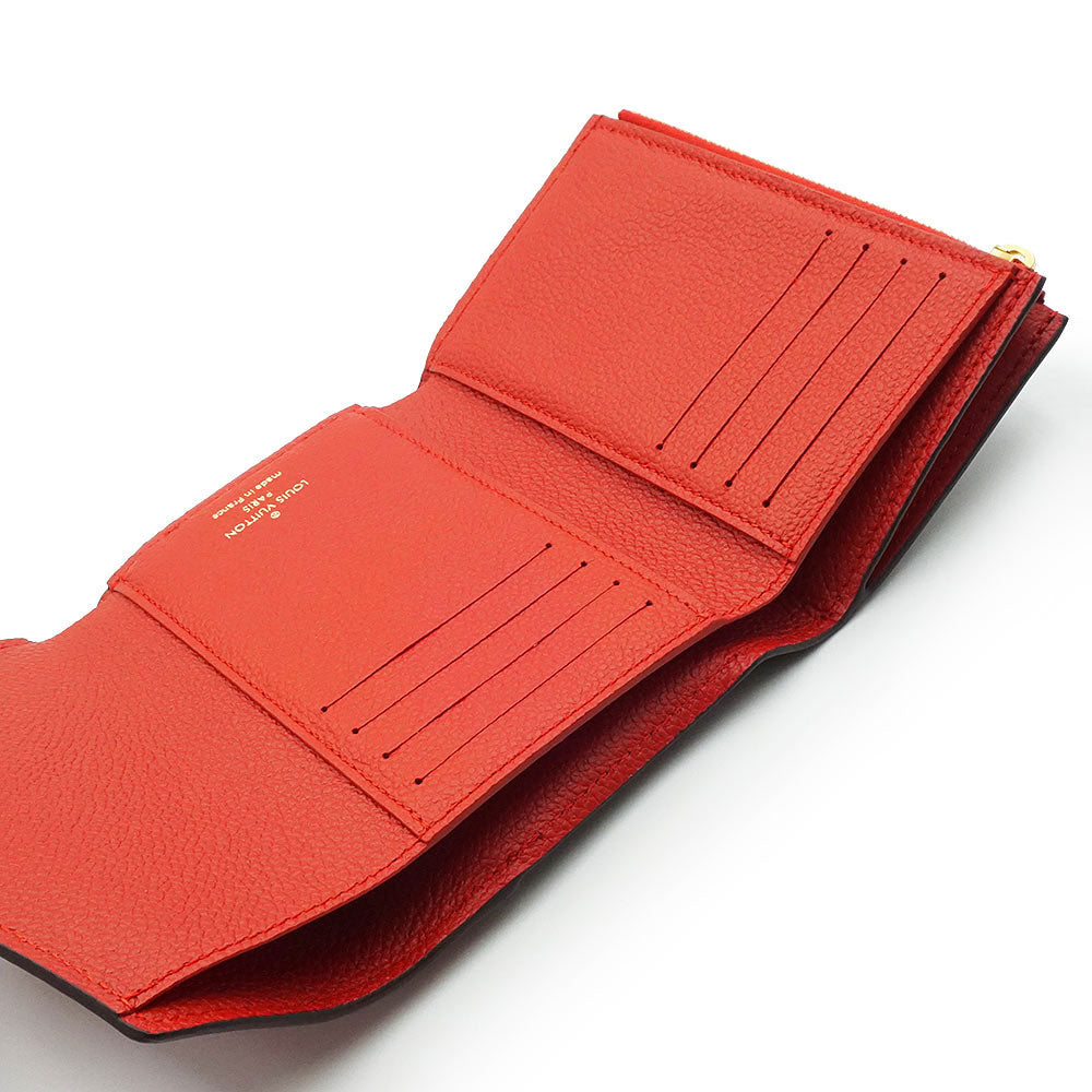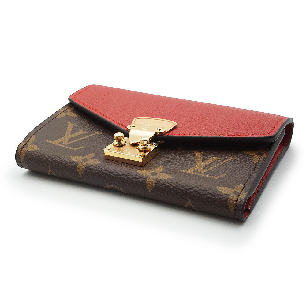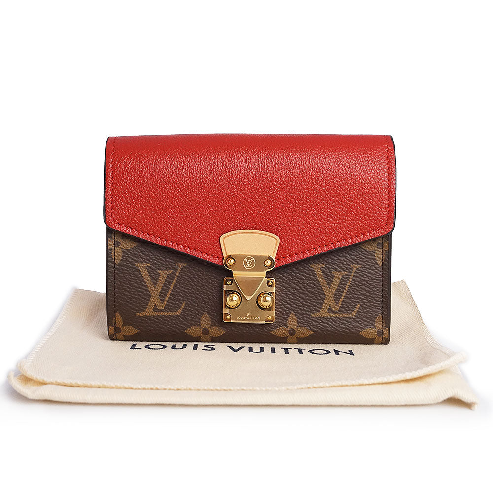 [全新未使用] Louis Vuitton Pallas Portefeuille 紧凑型三折钱包,采用字母小牛皮制成,带有红色和棕色樱桃红色图案,配有金色金属配件,M67478