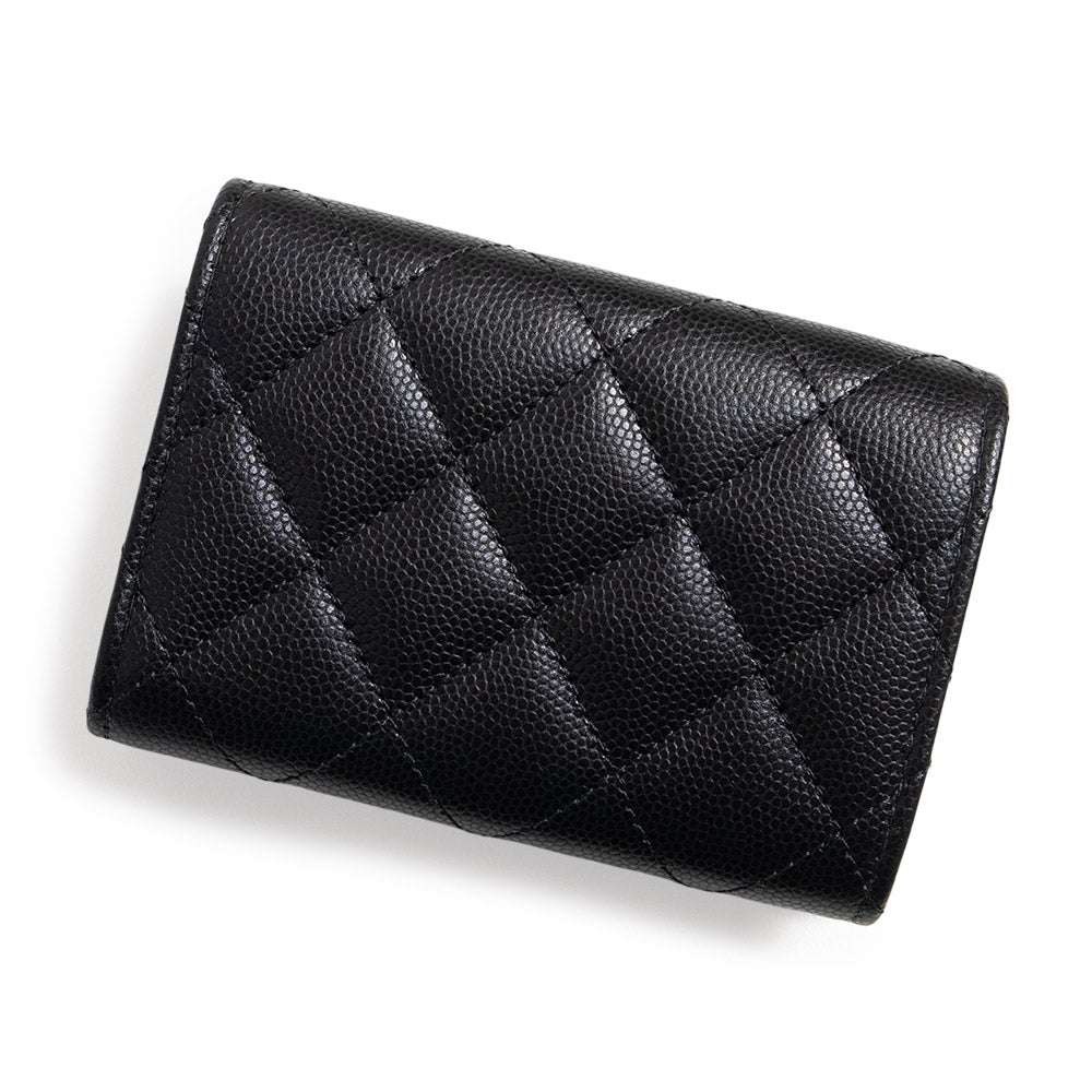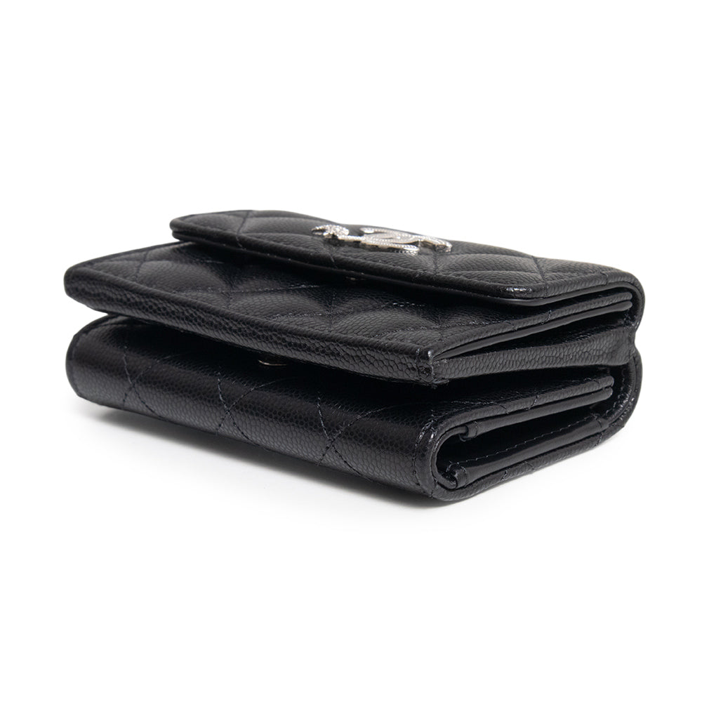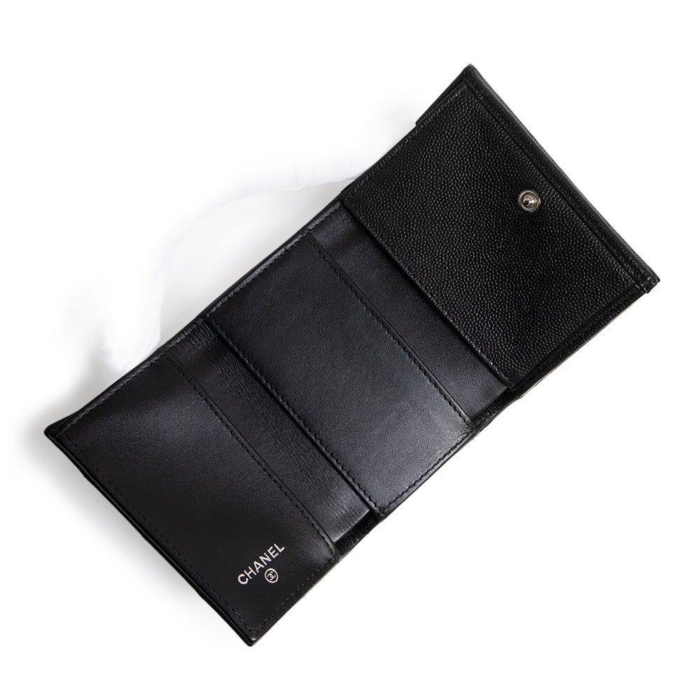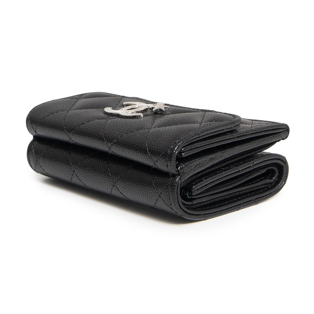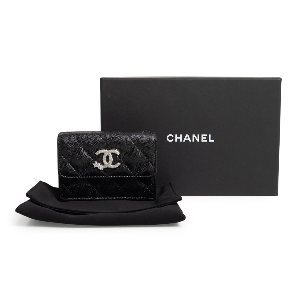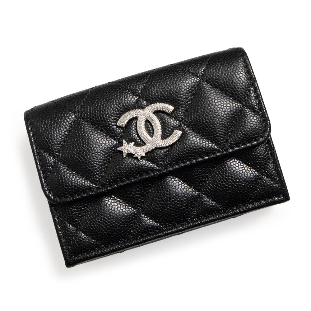 这款香奈儿小钱包饰有经典的Coco标志和星星图案。它单手握持舒适,同时提供充足的存储空间,设有钞票隔层、零钱包和卡位。这款时尚钱包采用奢华的黑色鱼子酱皮革制成,并饰有一颗水钻星星,堪称点睛之笔。