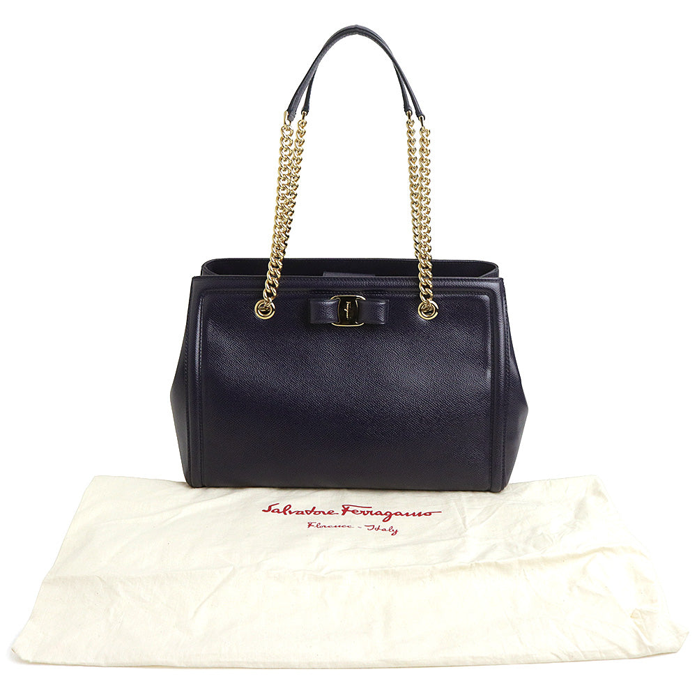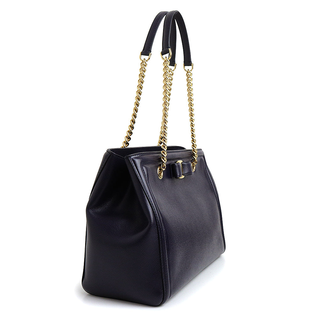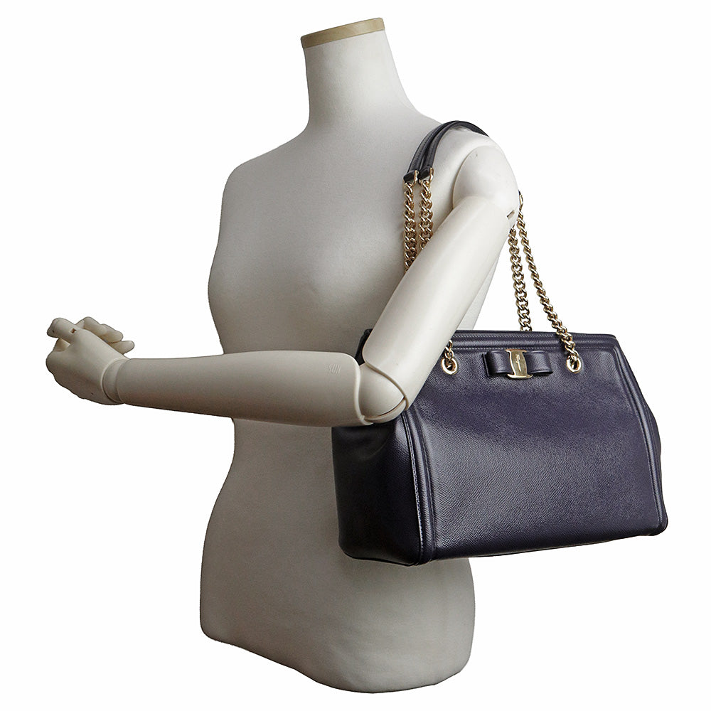 【全新未使用展示品】Salvatore Ferragamo Vara 缎带链条单肩包,海军蓝小牛皮材质,金色五金配件,GU-21 G508