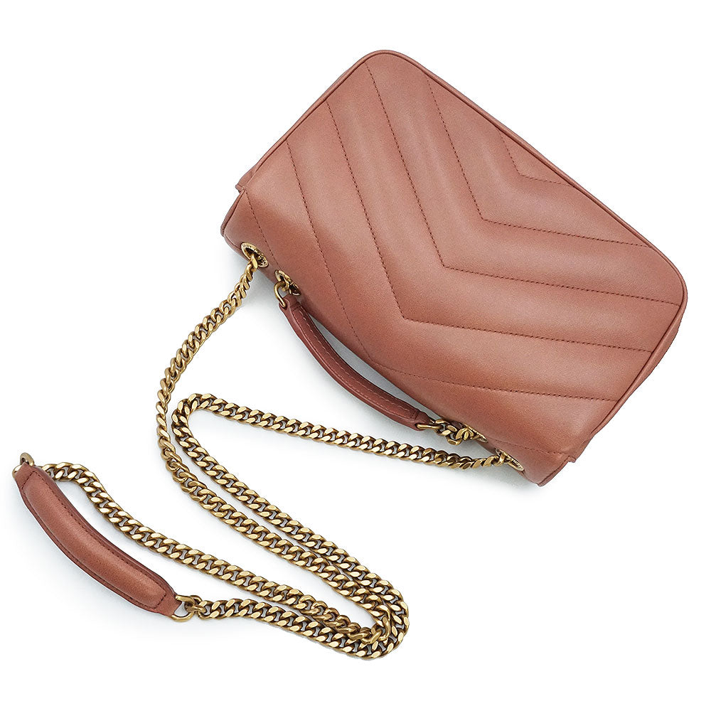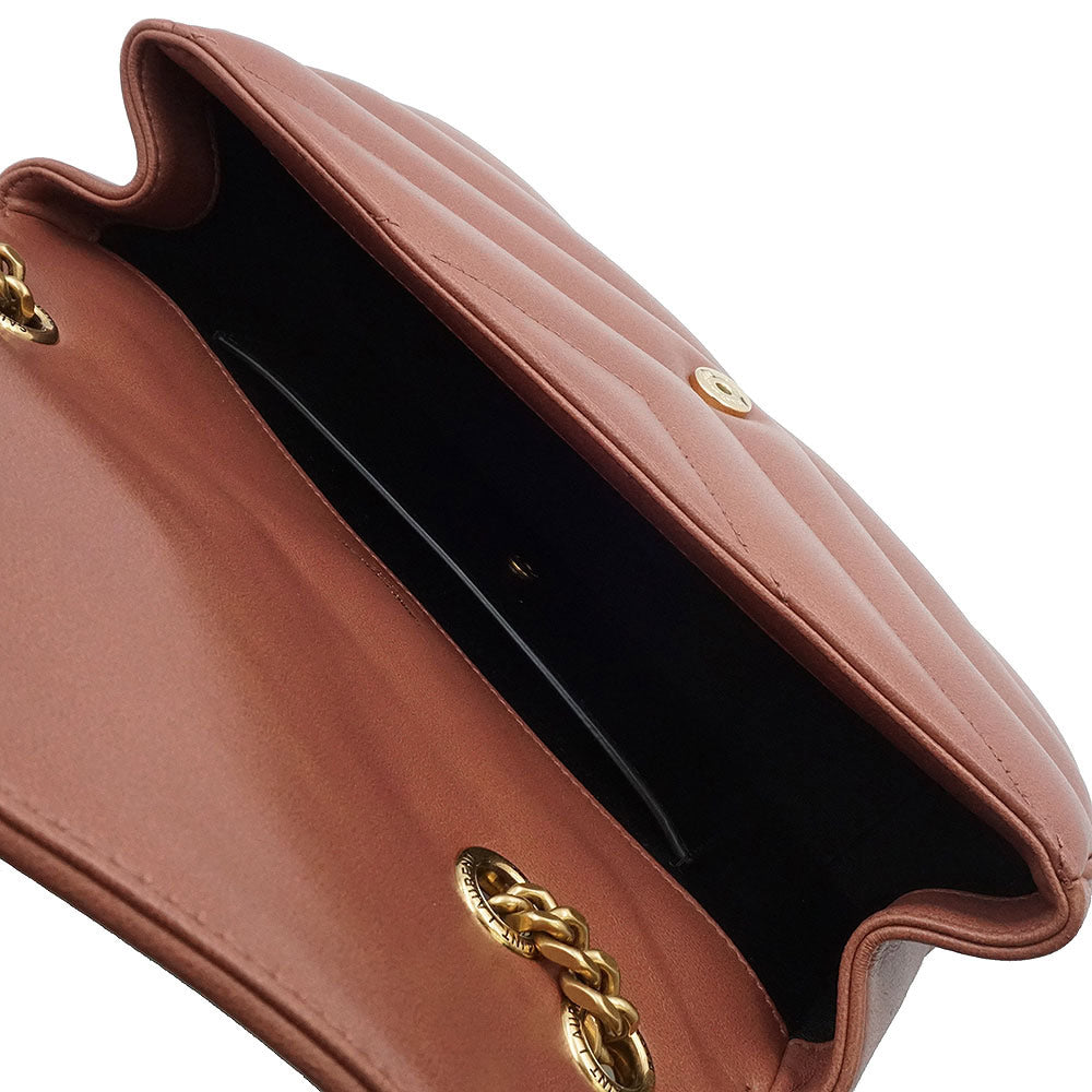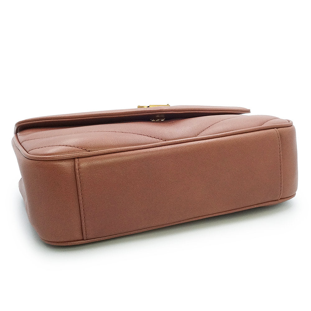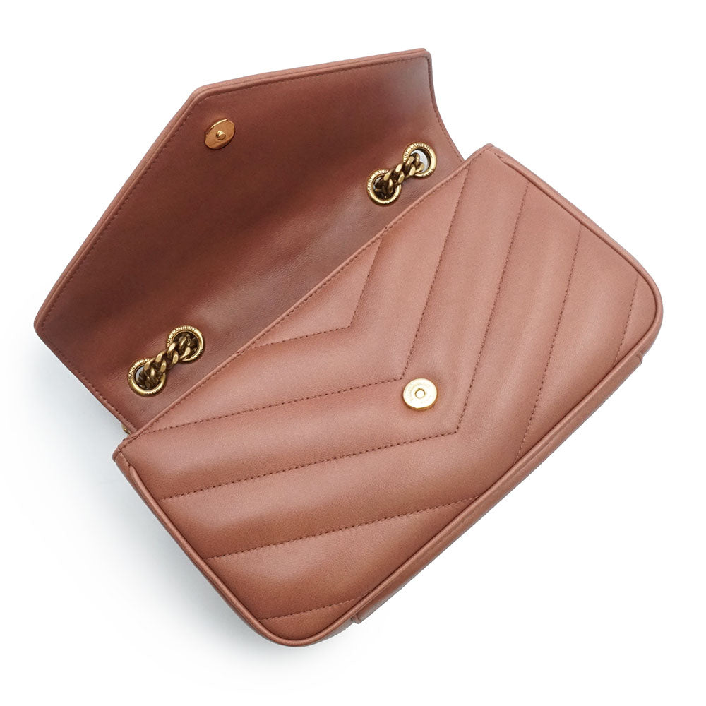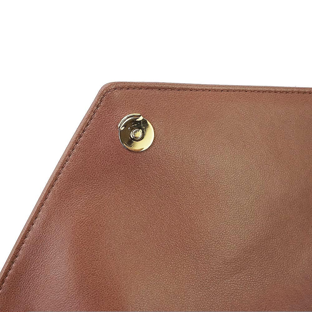 这款轻盈的信封包采用柔软的羊皮制成,饰以人字形绗缝。它配有可拆卸的皮革小袋和口袋镜。滑动式链条肩带可肩背或斜挎。