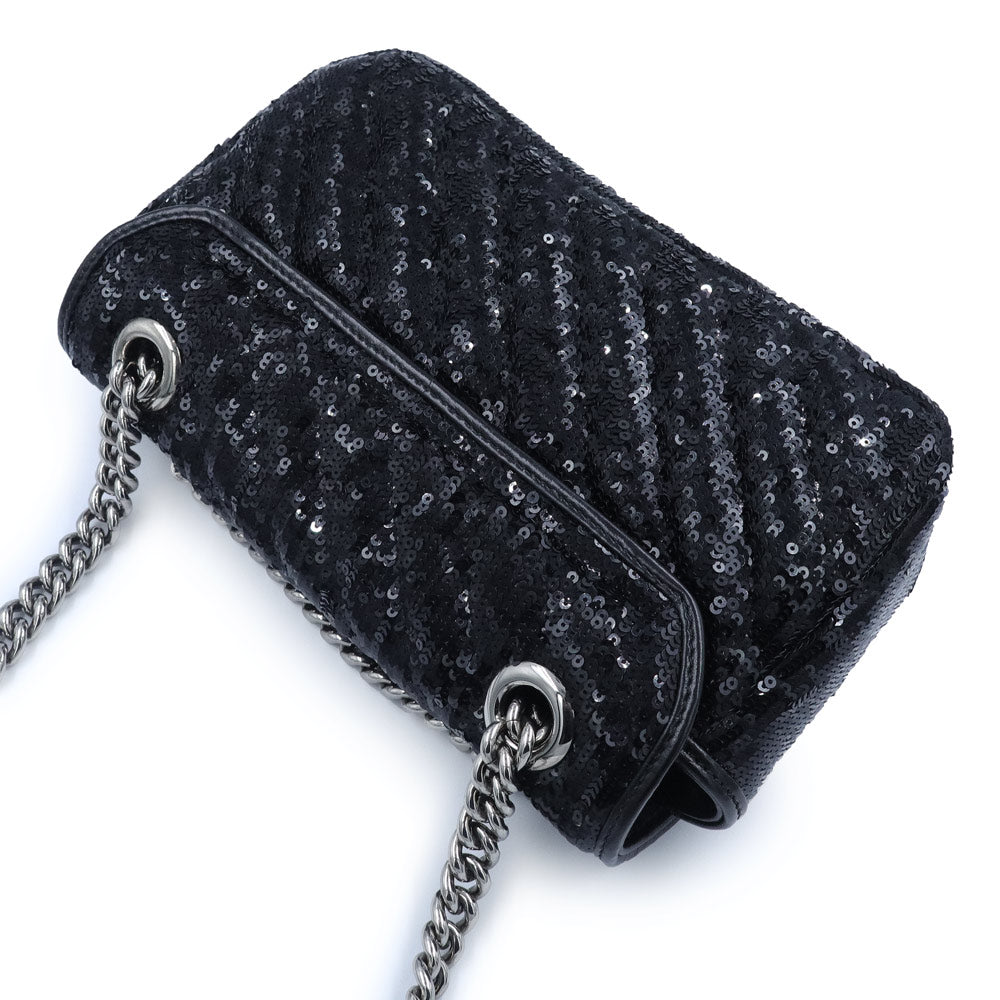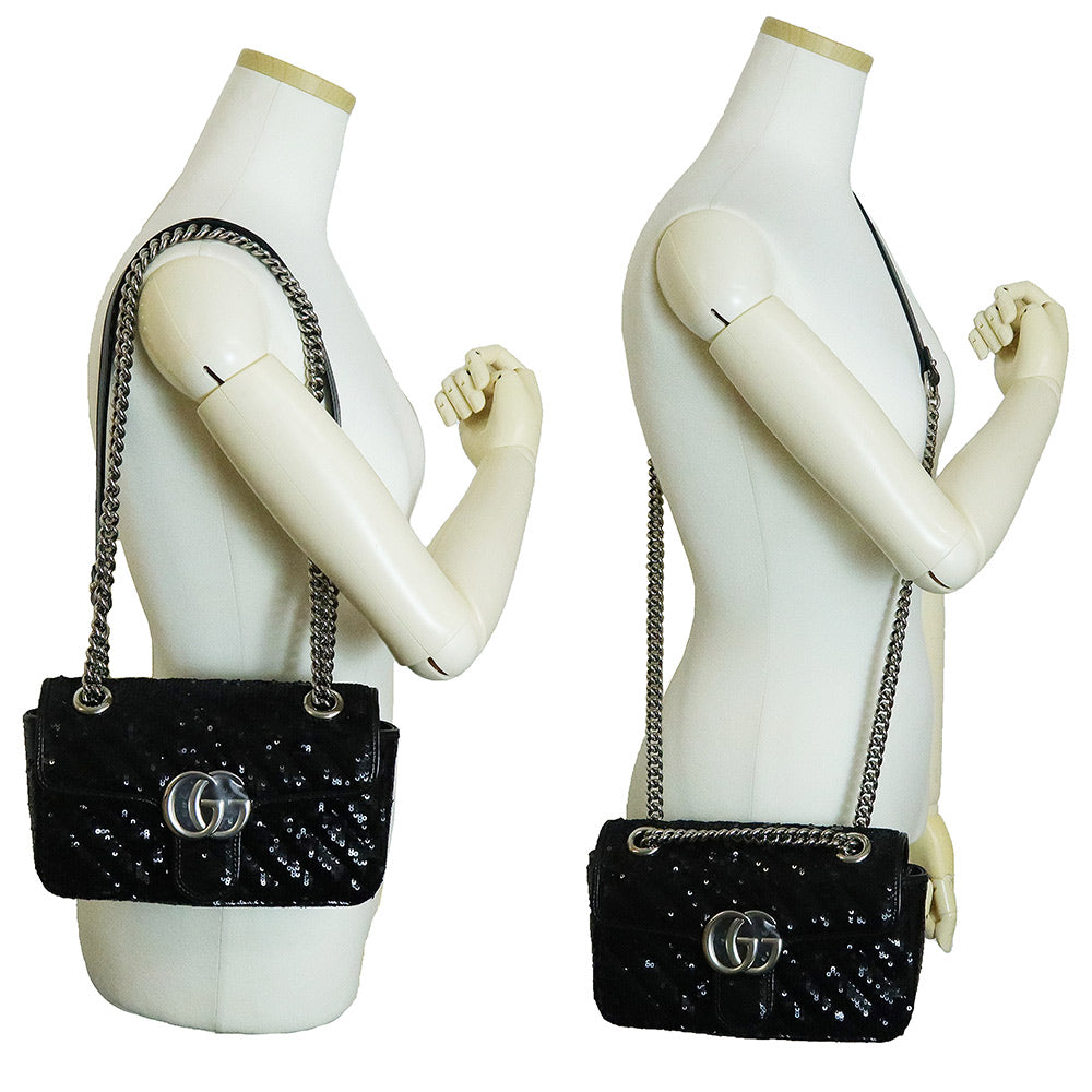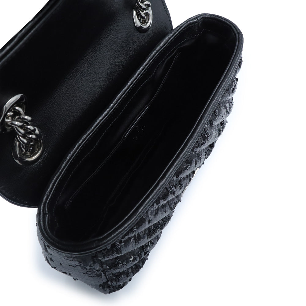 这款小巧的GG Marmont链条单肩包采用亮片和皮革的华丽组合。滑动式链条肩带让您可以随心所欲地将其作为单肩包或手提包佩戴,打造多种风格。