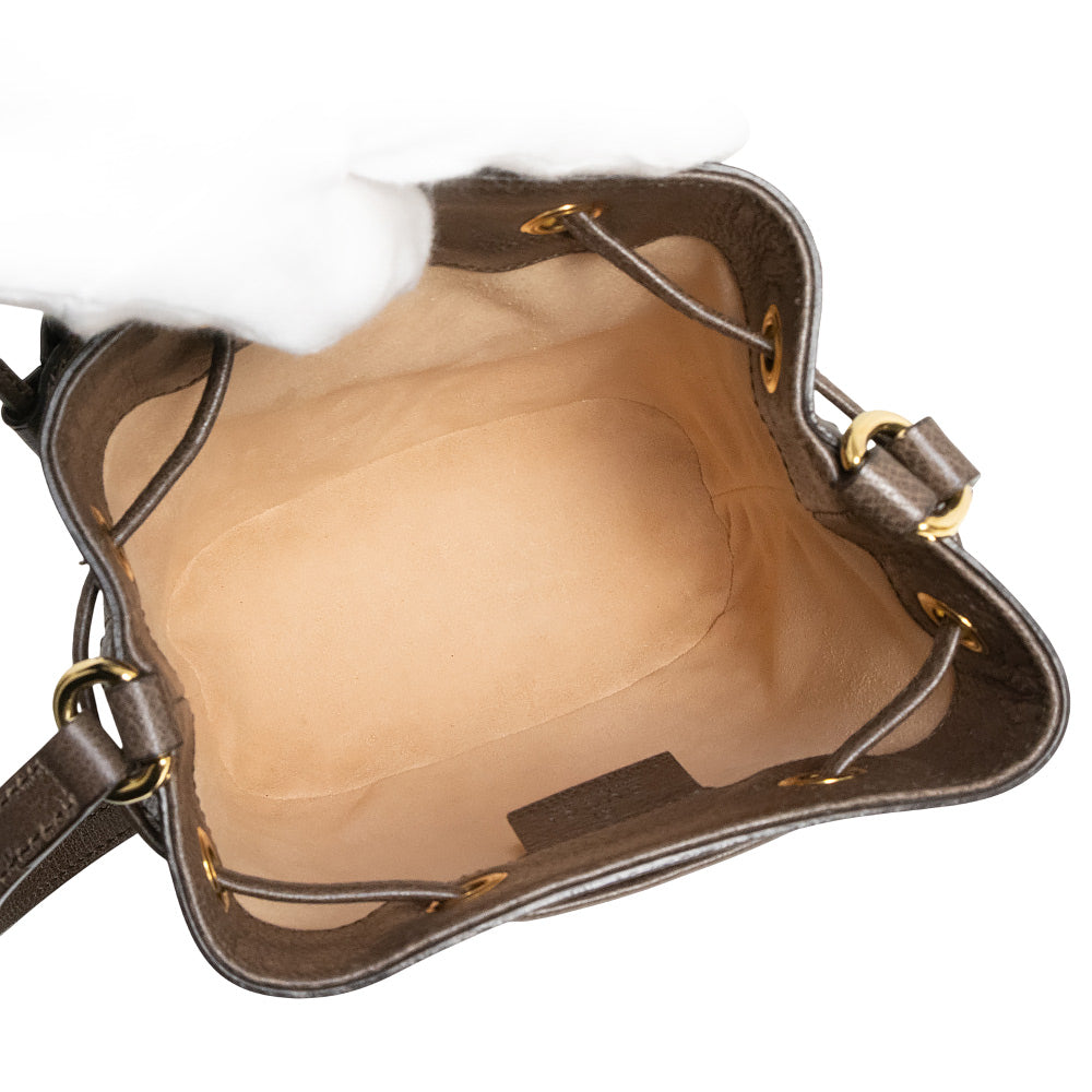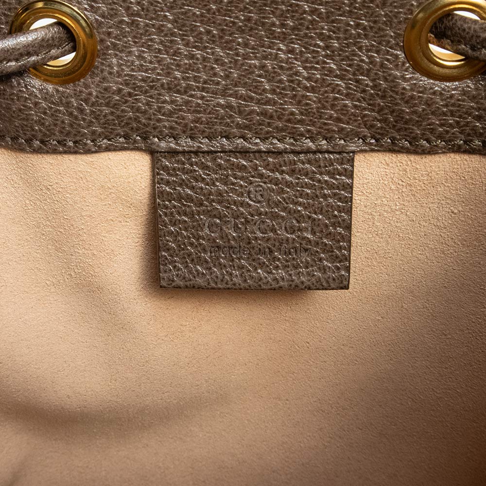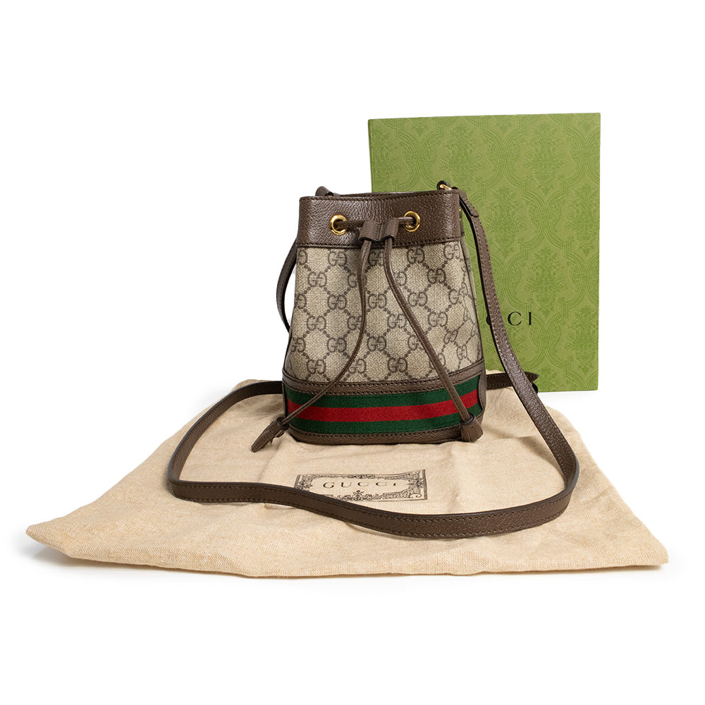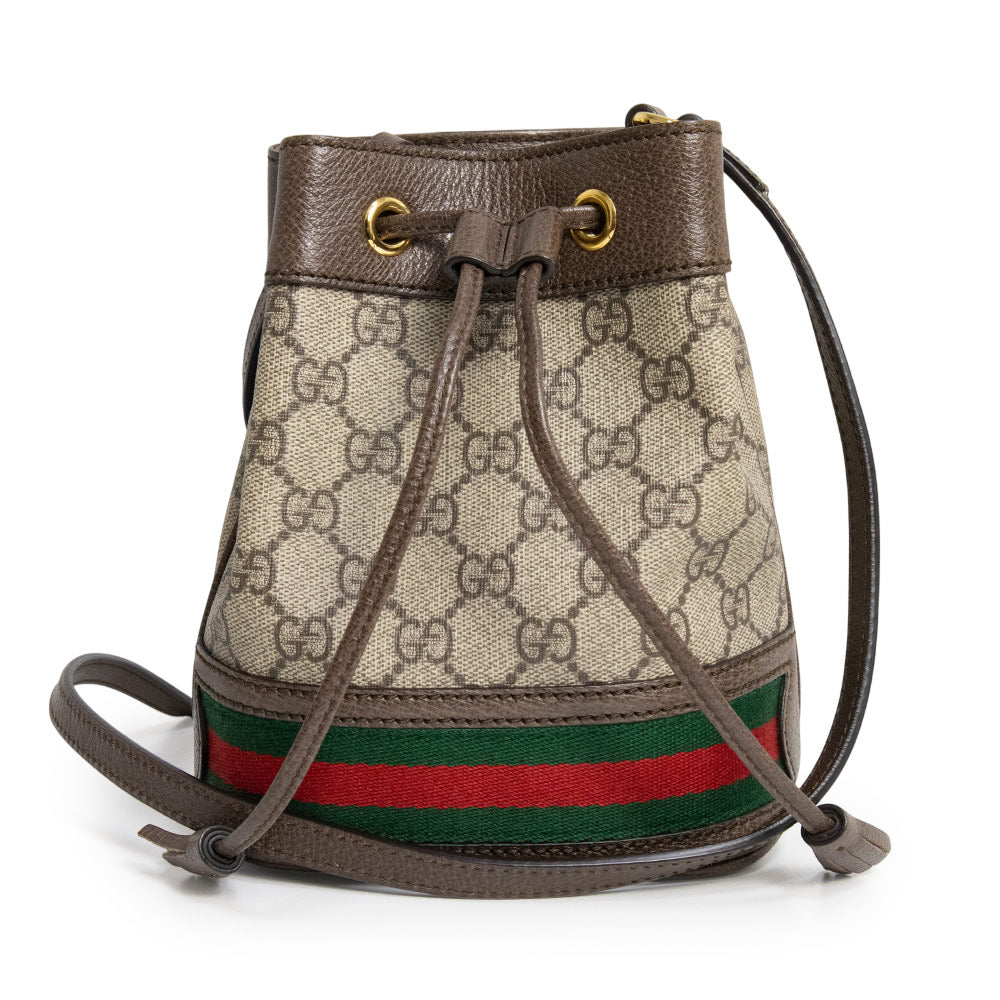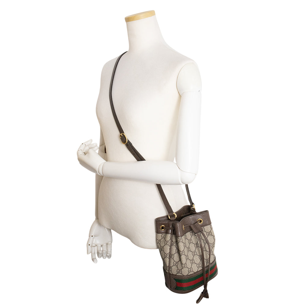 Gucci迷你水桶包,采用GG Supreme帆布制成,底部饰有织带条纹,并配有可调节肩带。