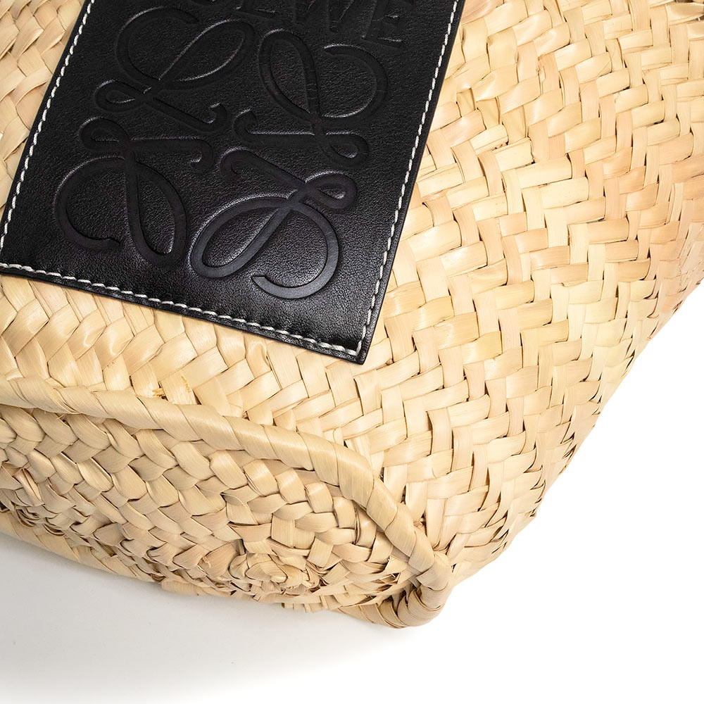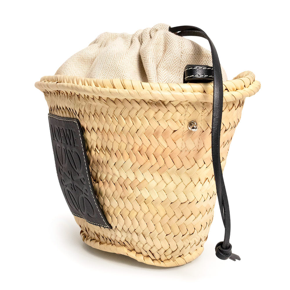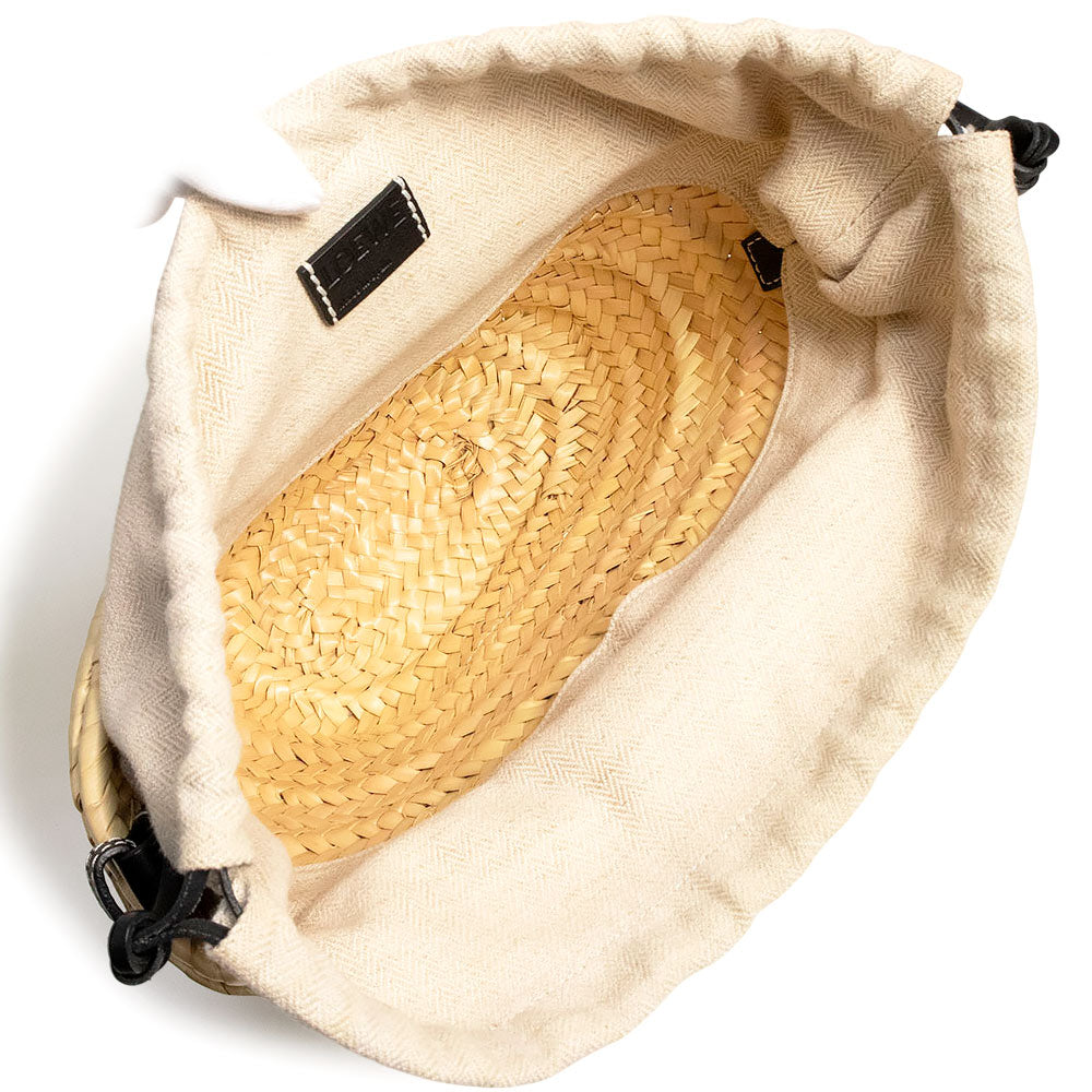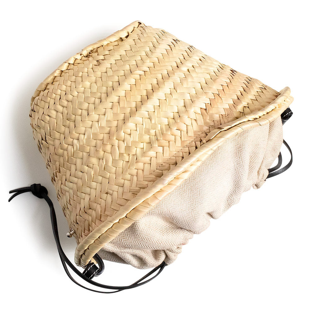 这款经典的手工编织棕榈叶水桶包配有小牛皮肩带和人字纹棉帆布抽绳包口。它产自西班牙,采用摩洛哥工匠种植、采摘、晒干并手工编织的棕榈叶制成。