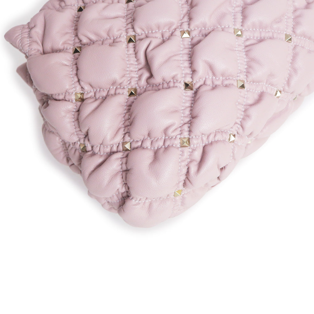 Valentino 的 Spike Me 单肩包采用柔软皮革制成,饰有菱格纹绗缝图案和醒目的铆钉装饰。可拆卸肩带使其可以斜挎佩戴。 |