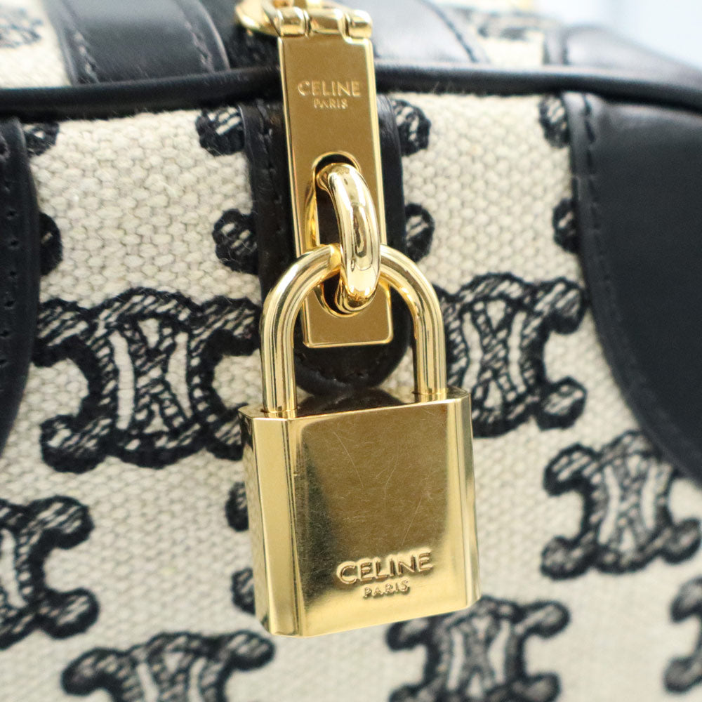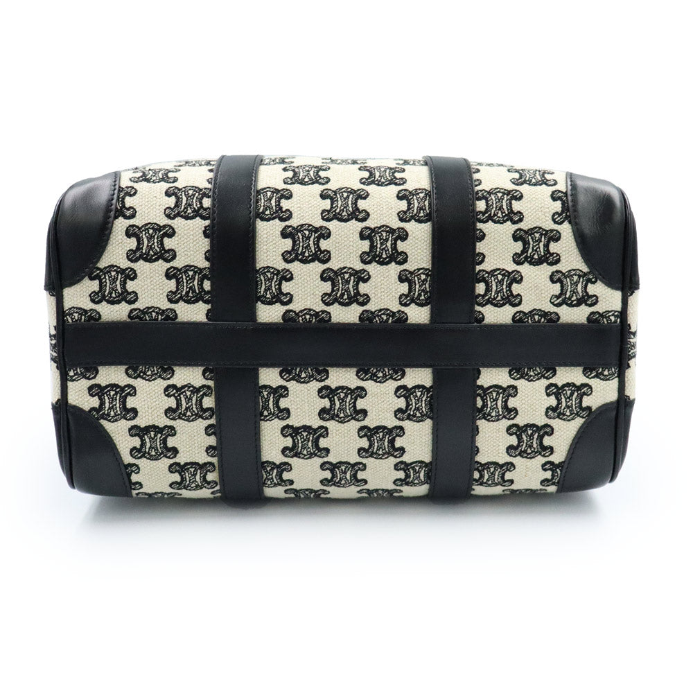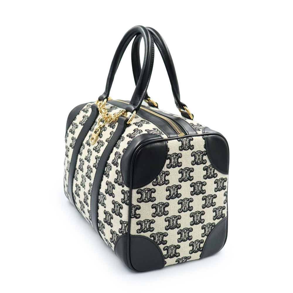 【全新未使用展示品】CELINE 193652CS8 Triomphe 帆布刺绣小号手提波士顿包,皮革 Triomphe 帆布黑色/象牙色单肩包/斜挎包,金色五金配件