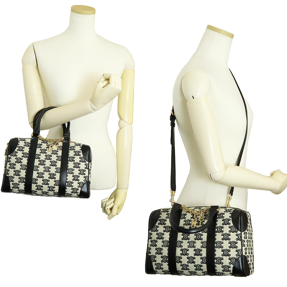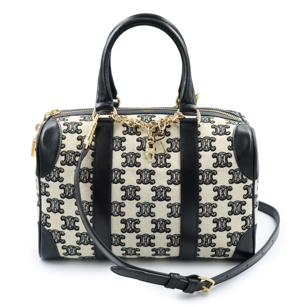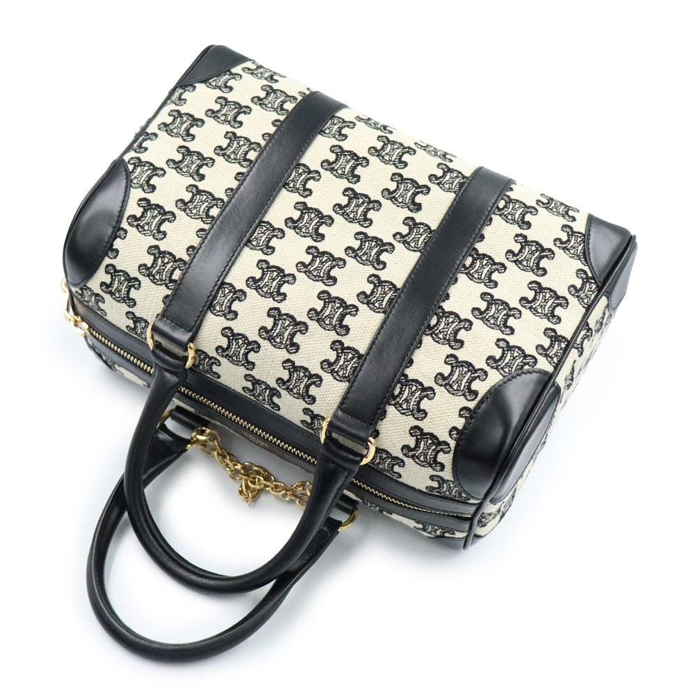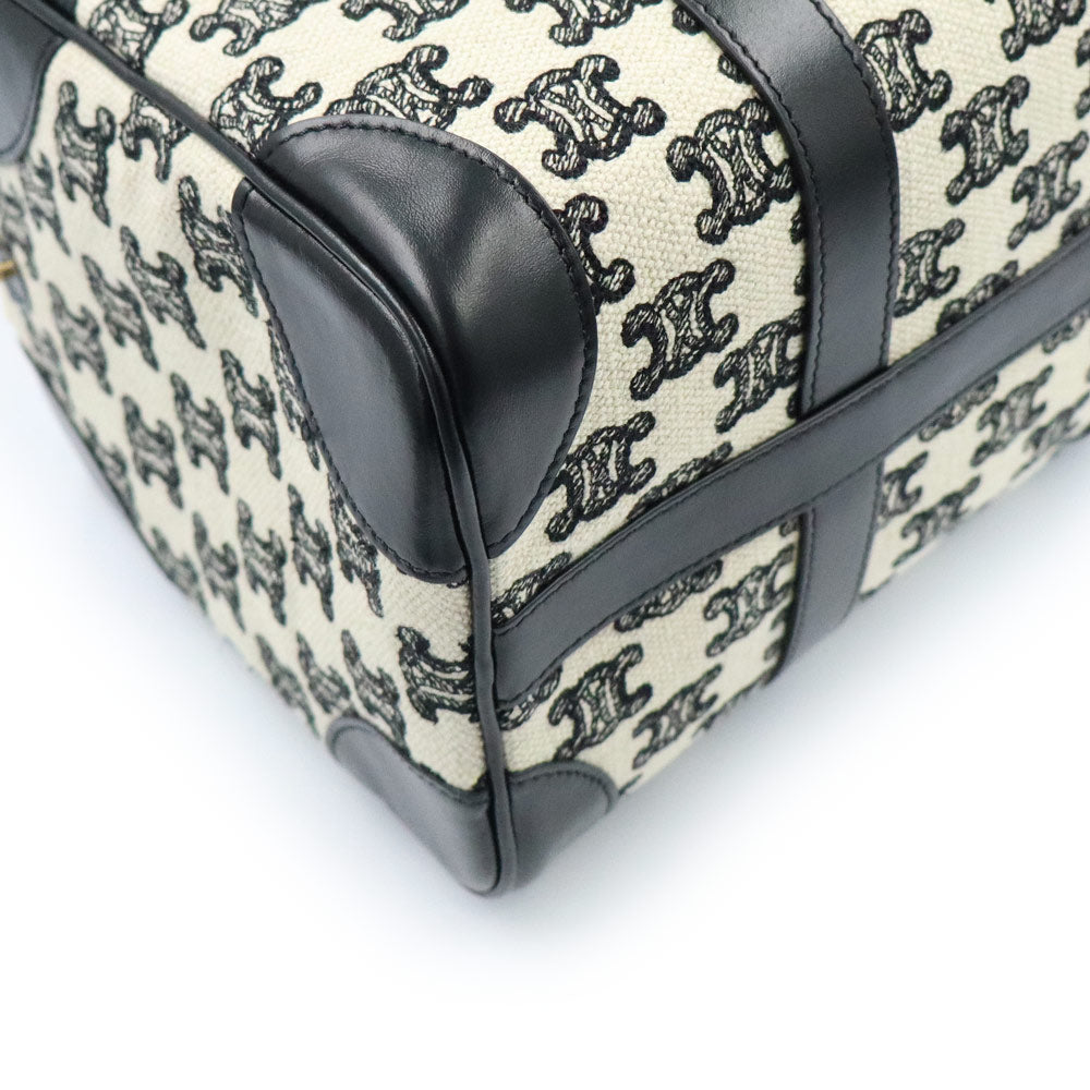 【全新未使用展示品】CELINE 193652CS8 Triomphe 帆布刺绣小号手提波士顿包,皮革 Triomphe 帆布黑色/象牙色单肩包/斜挎包,金色五金配件