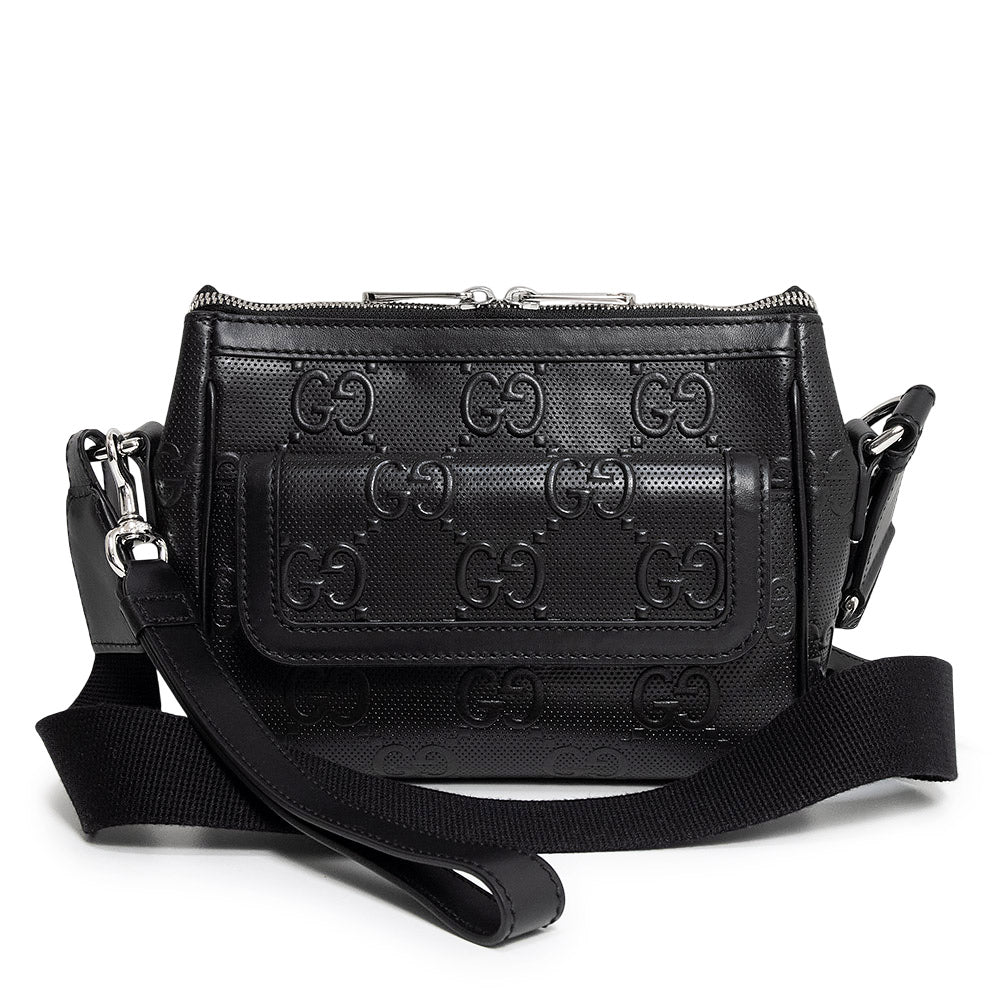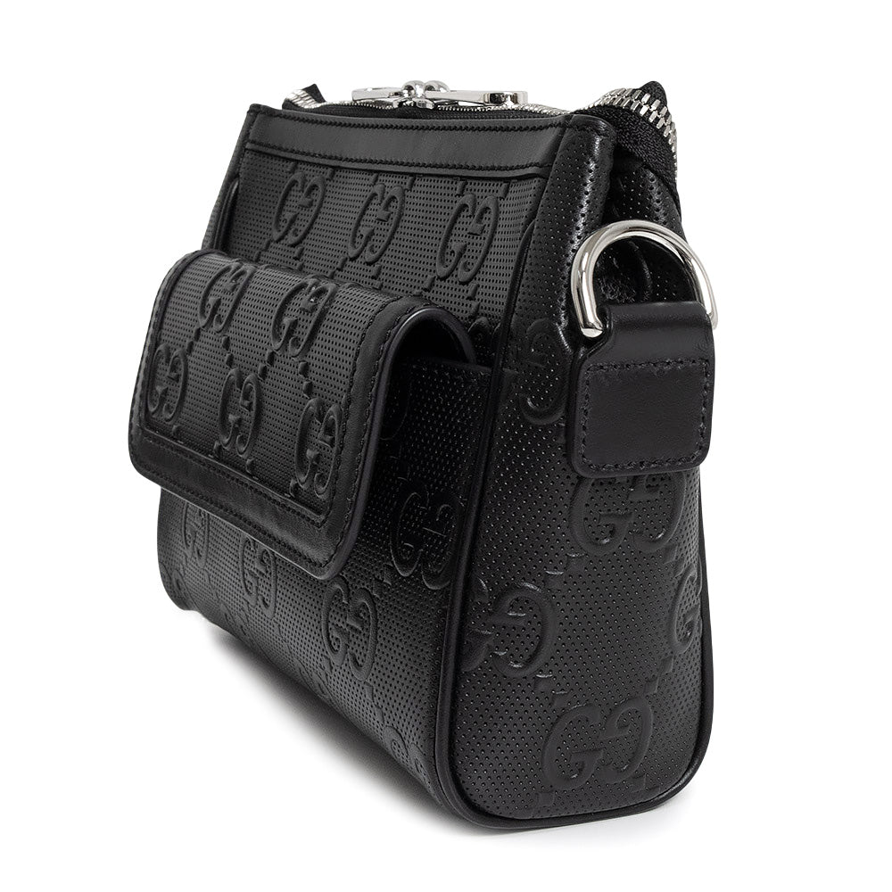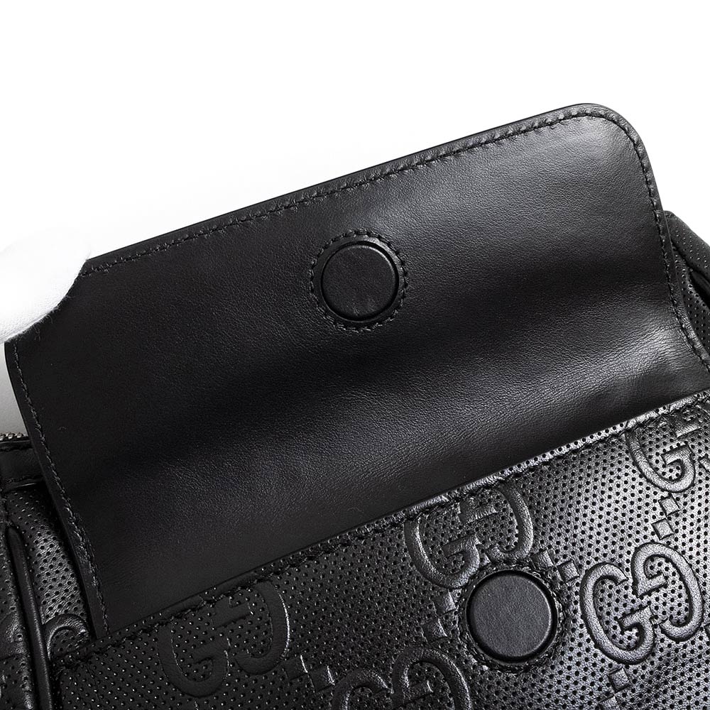 这款 Gucci GG 压纹斜挎包采用 GG 压纹皮革精制而成。银色五金配件在黑色皮革的映衬下格外醒目,营造出摩登精致的风格。它既可以作为单肩包使用,也可以将肩带系在肩上作为副包使用,让您可以根据自己的风格和场合灵活搭配。
