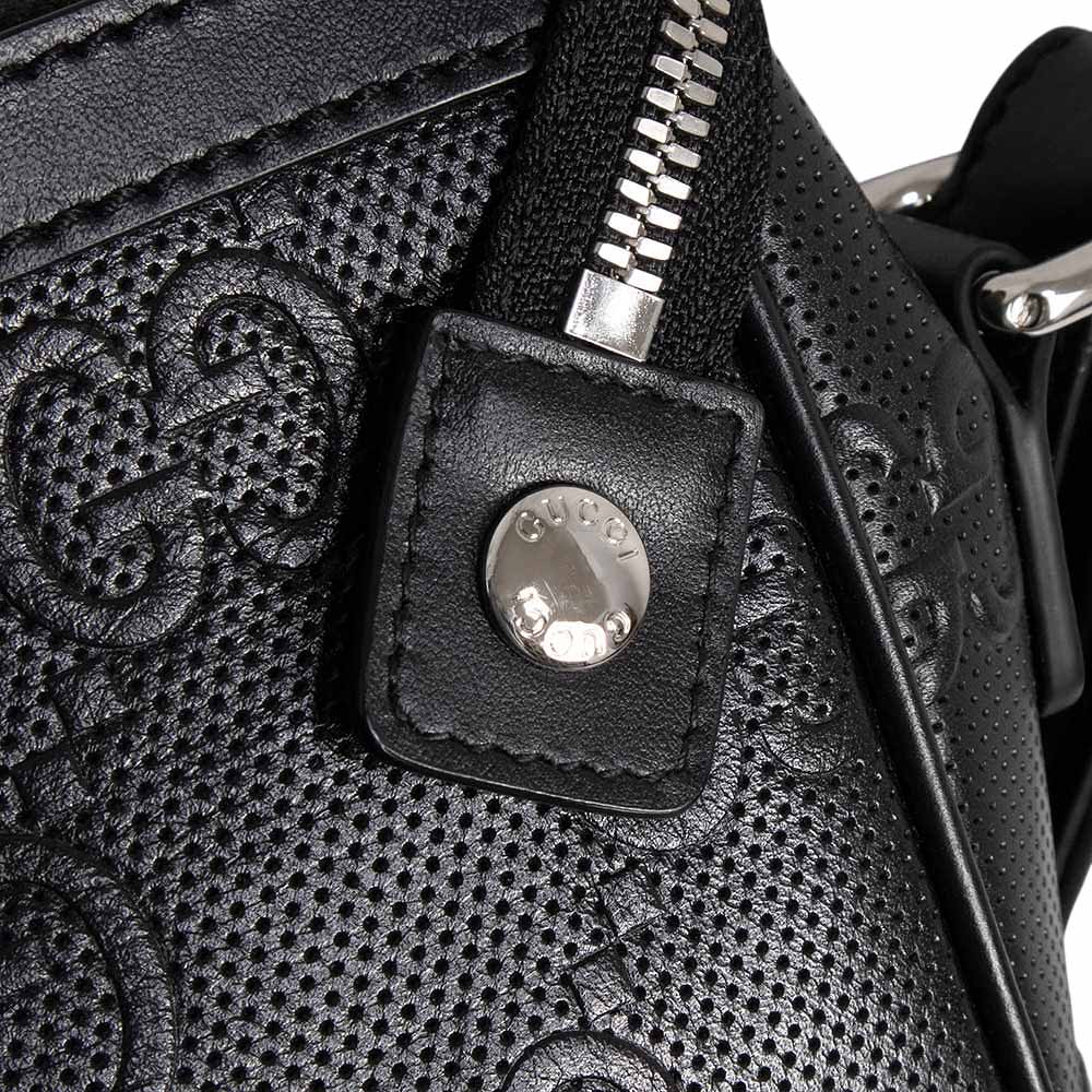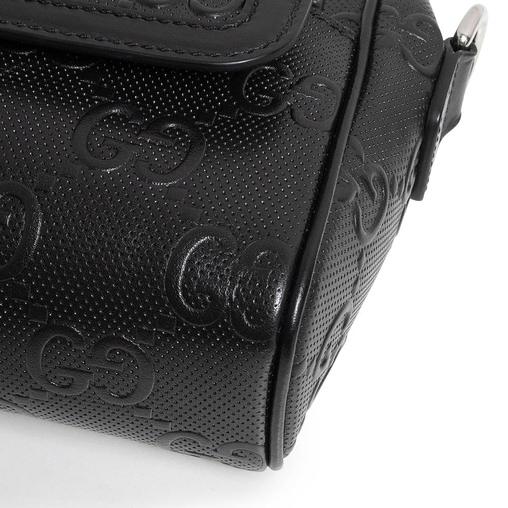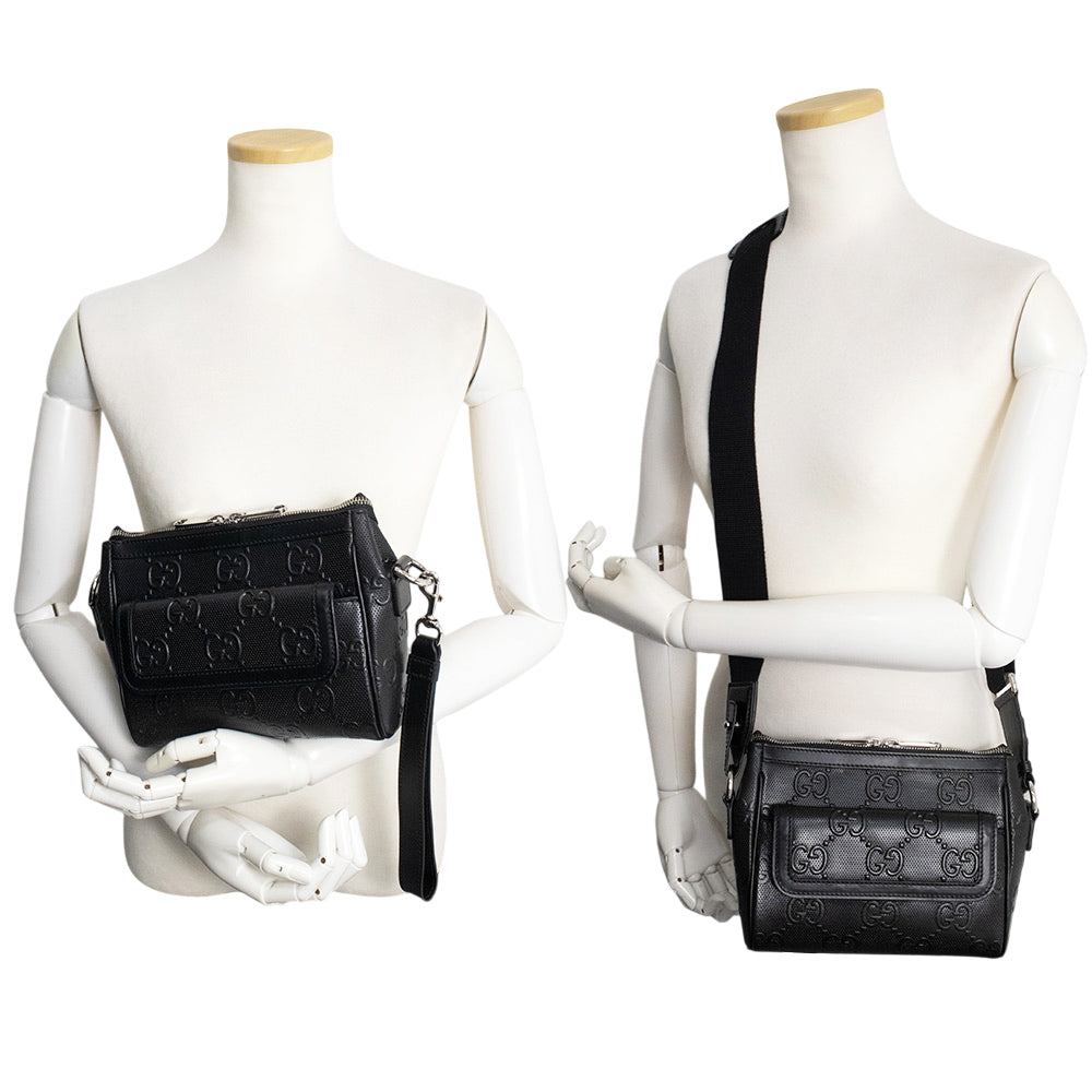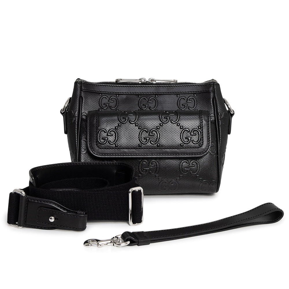 这款 Gucci GG 压纹斜挎包采用 GG 压纹皮革精制而成。银色五金配件在黑色皮革的映衬下格外醒目,营造出摩登精致的风格。它既可以作为单肩包使用,也可以将肩带系在肩上作为副包使用,让您可以根据自己的风格和场合灵活搭配。