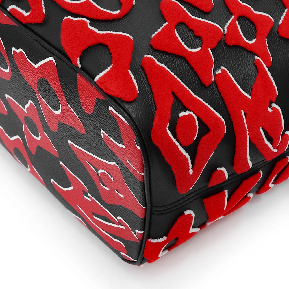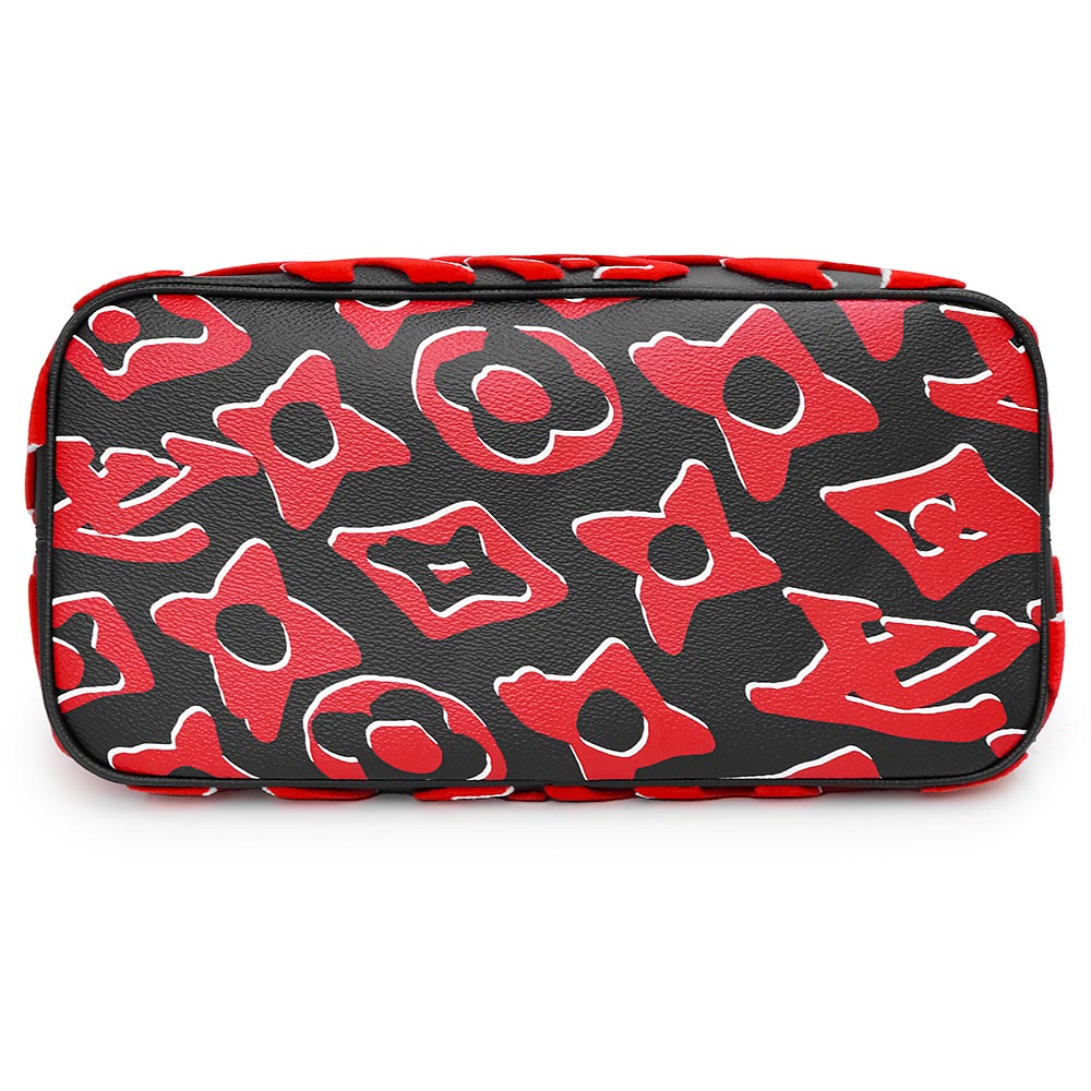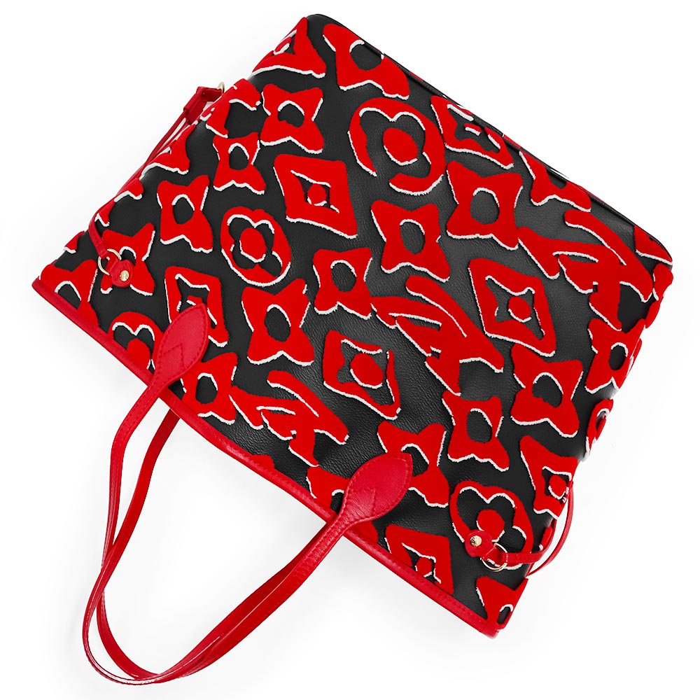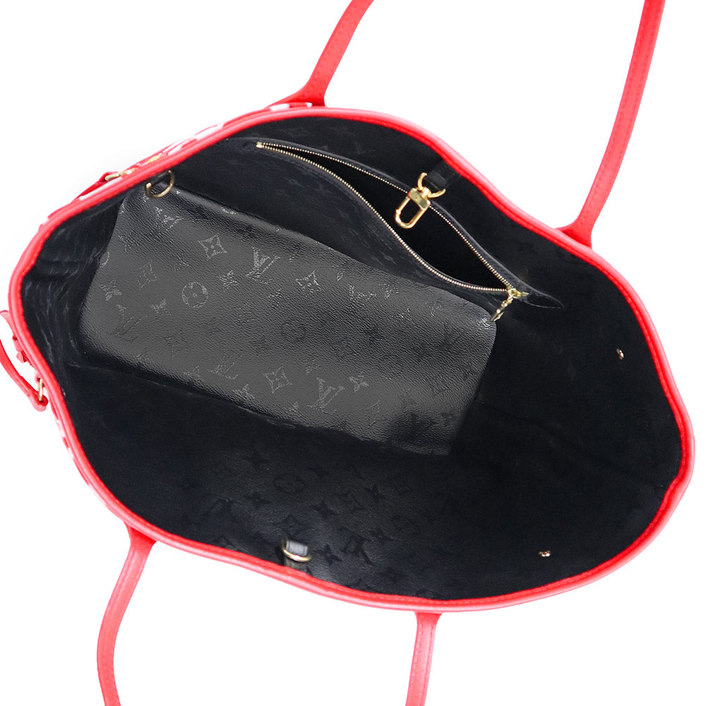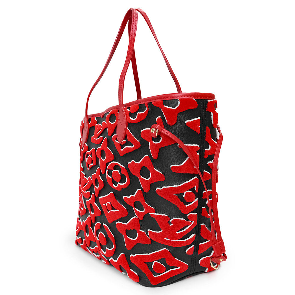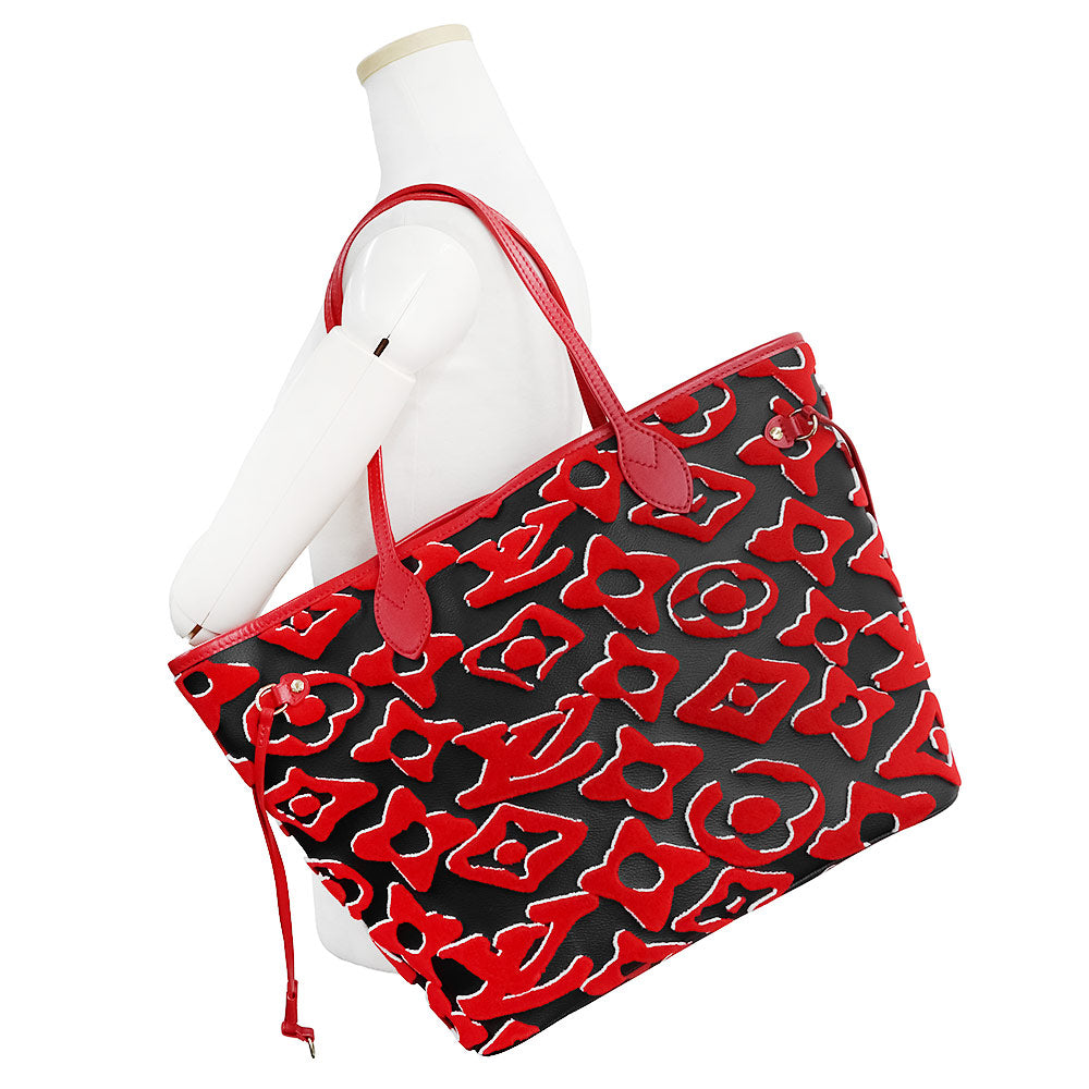 [未使用的展品] 路易威登 Neverfull MM URS FISCHER 协作手提包 皮革交织字母 红色 黑色 金配件 M45544