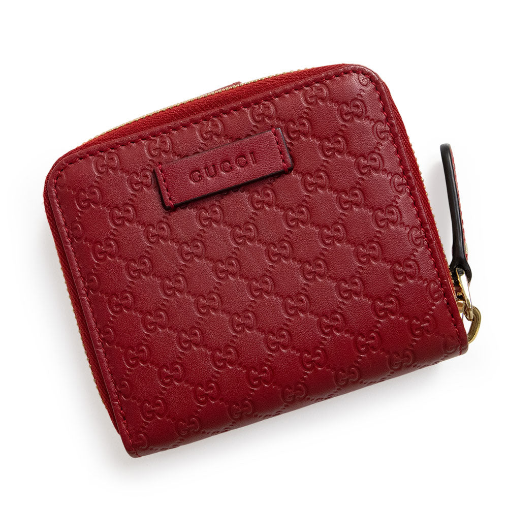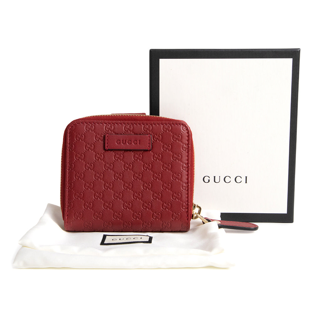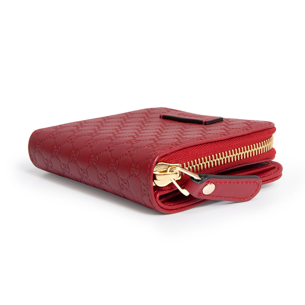 全新未使用 Gucci Signature Compact 双折钱包,Micro Guccissima 皮革材质,红色和金色五金配件(产品编号:449395),带原装盒