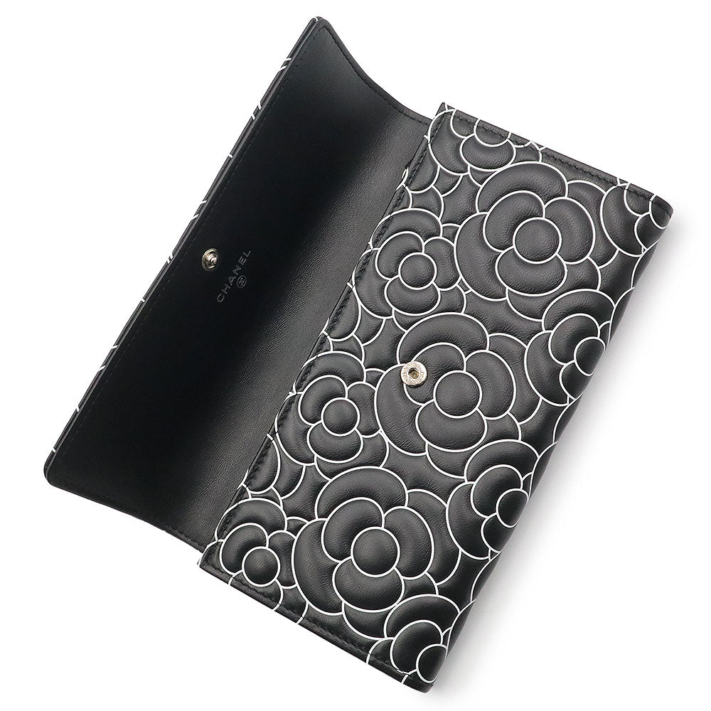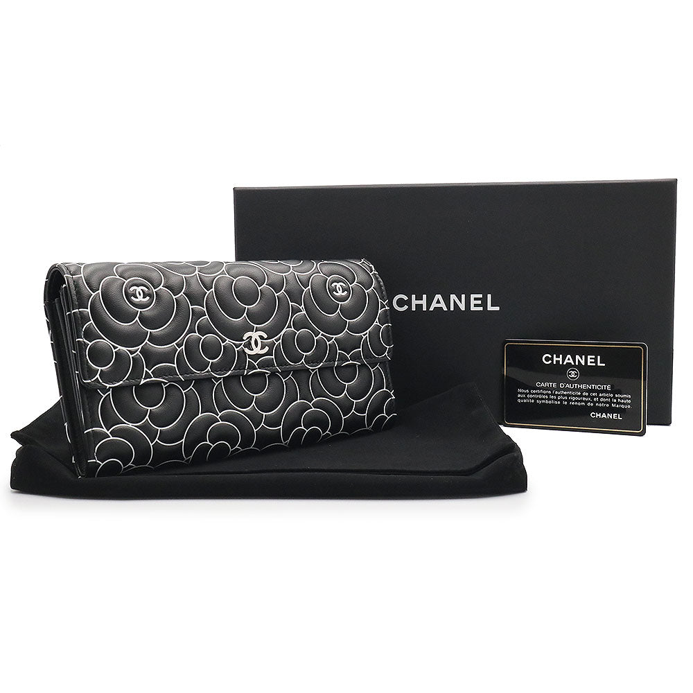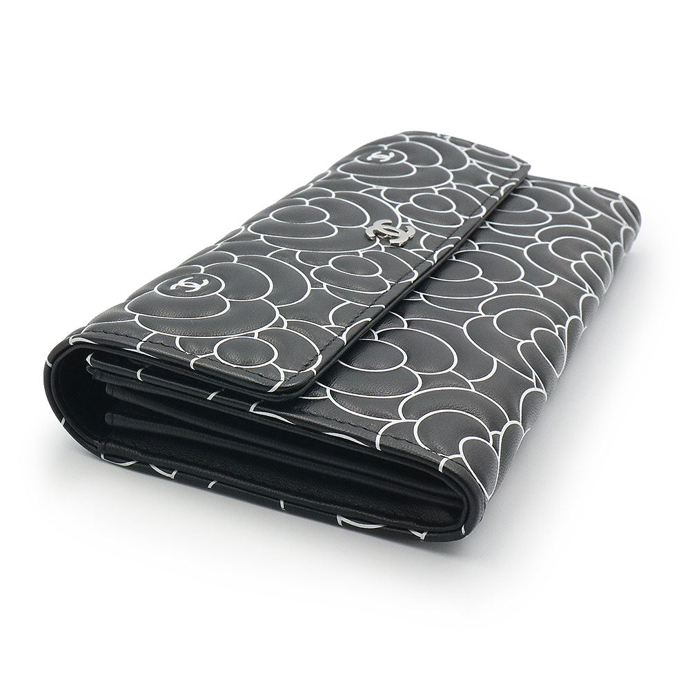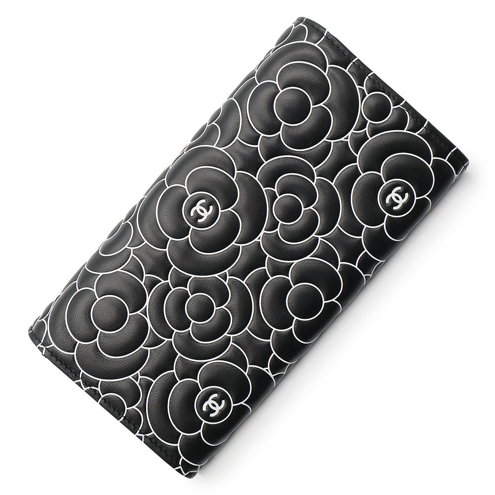 【新品・未使用品】シャネル CHANEL カメリアエンボス フラップ ウォレット 二つ折り長財布 ラムスキン レザー ブラック ホワイト シルバー金具 A82283 箱付