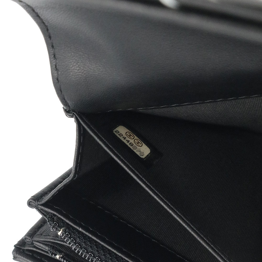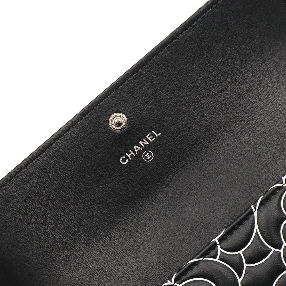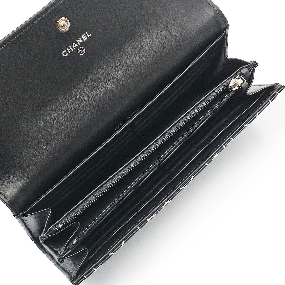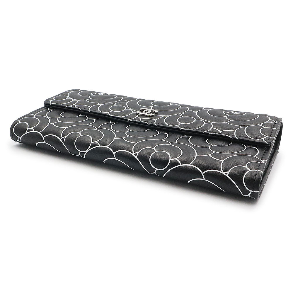 【新品・未使用品】シャネル CHANEL カメリアエンボス フラップ ウォレット 二つ折り長財布 ラムスキン レザー ブラック ホワイト シルバー金具 A82283 箱付