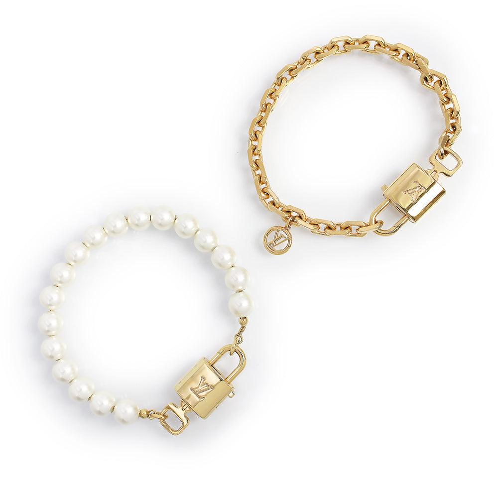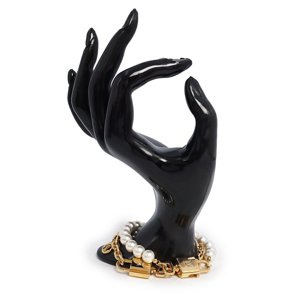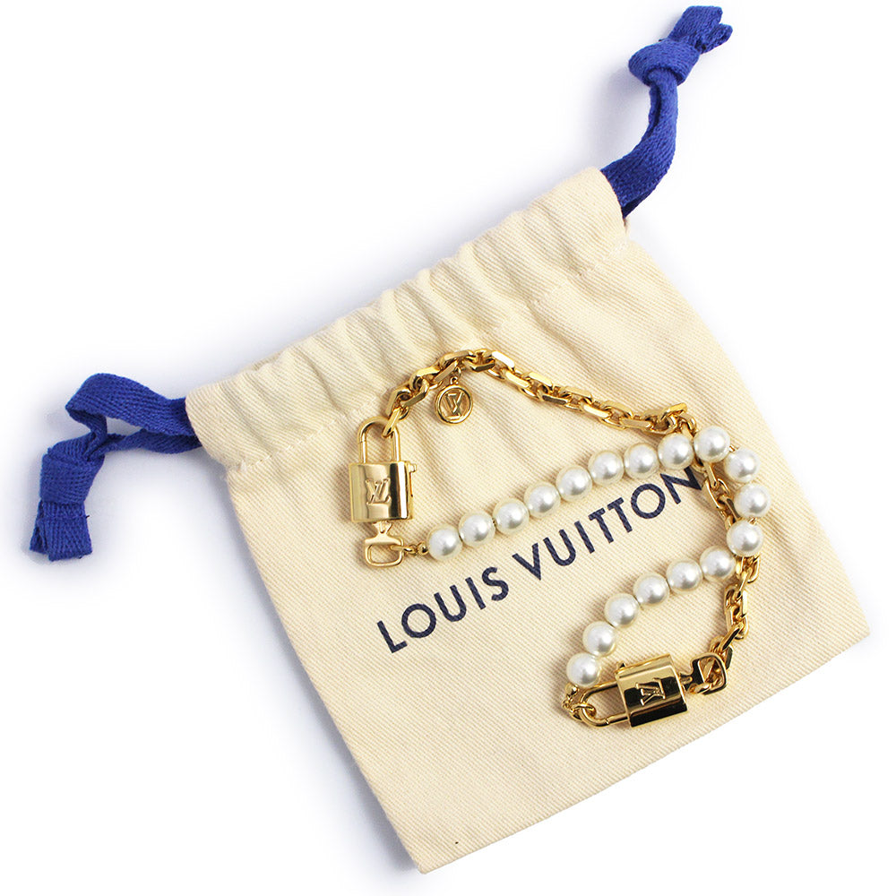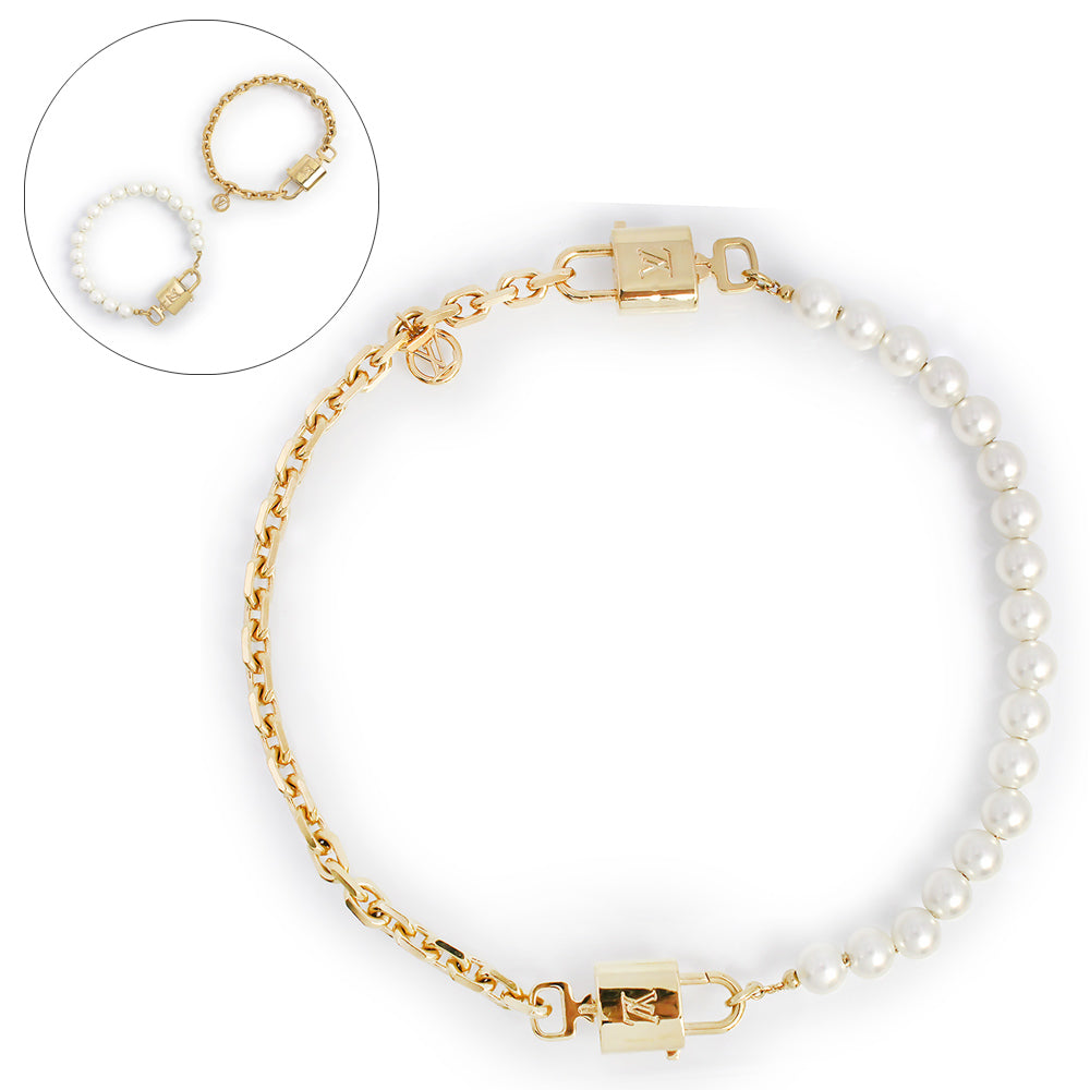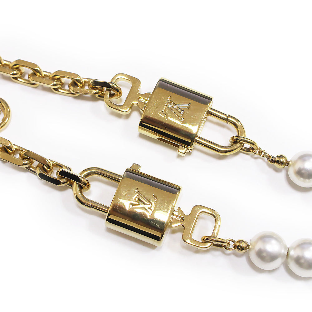ヴィトンより、ネックレスにもブレスレットにも使用可能なネックレスパールロックです。メゾンのアイコニックなモチーフと真珠のタイムレスな美しさを融合させた2WAYデザインのジュエリー。ゴールドカラーのメタルチェーンと繊細なホワイトレジンパールのストリングが、LVシグネチャーの2つのパドロックとキーで繋ぎ合わされています。エレガントかつ多用途なこのアイテムは、チョーカーとしても、コントラストを楽しむ2本のブレスレットとしても着用いただけます。 |