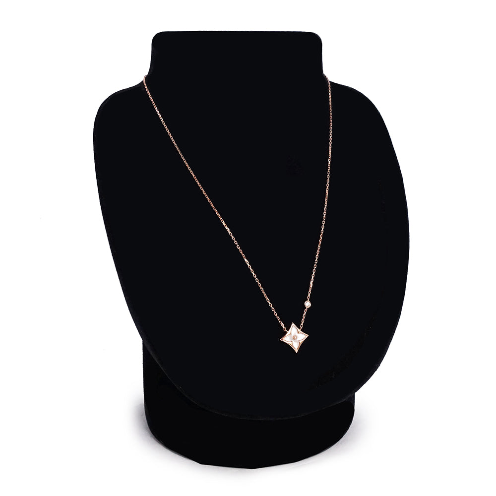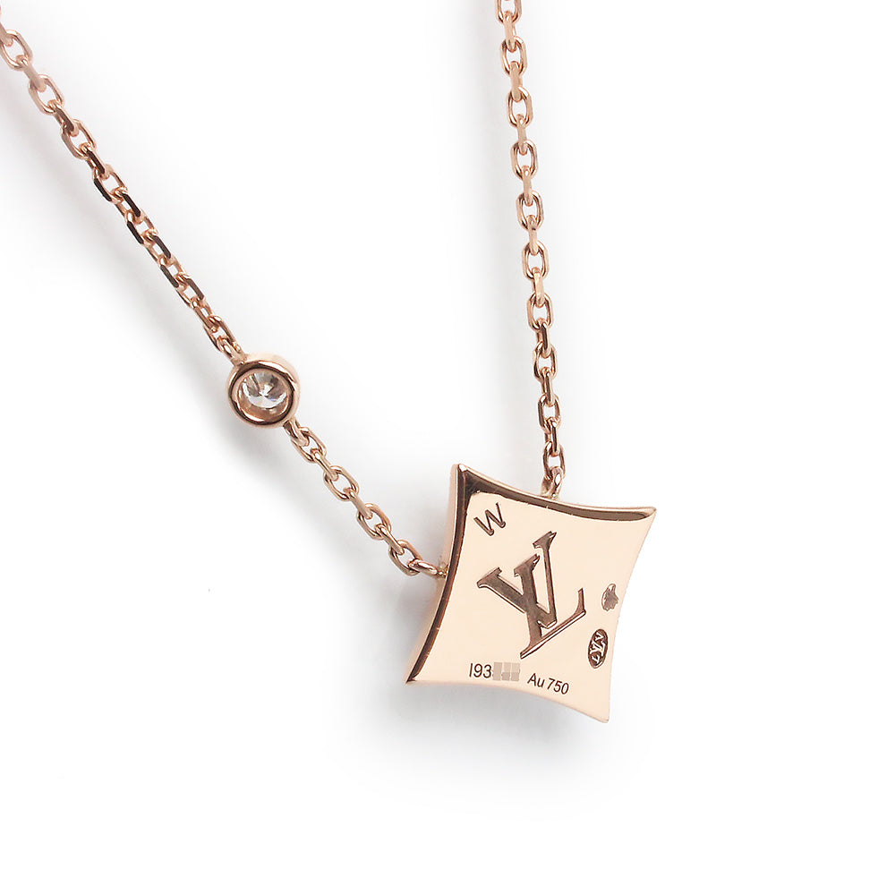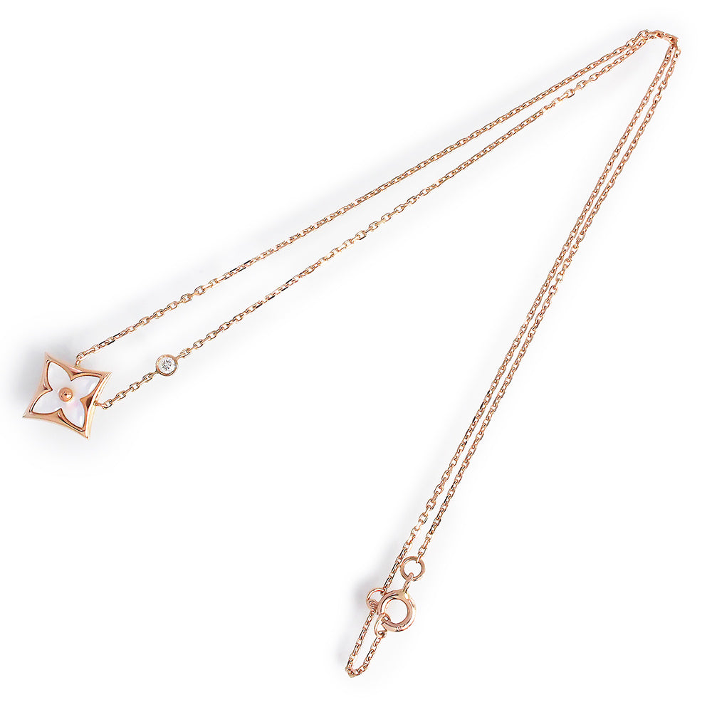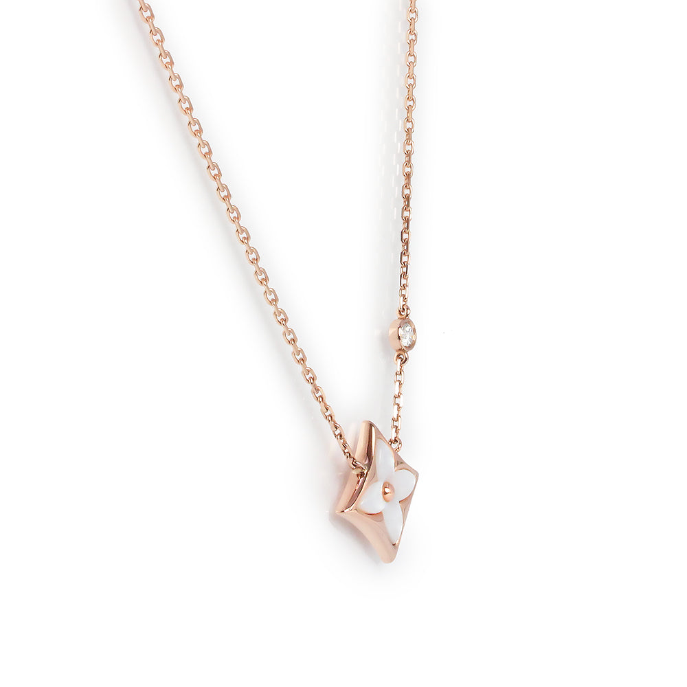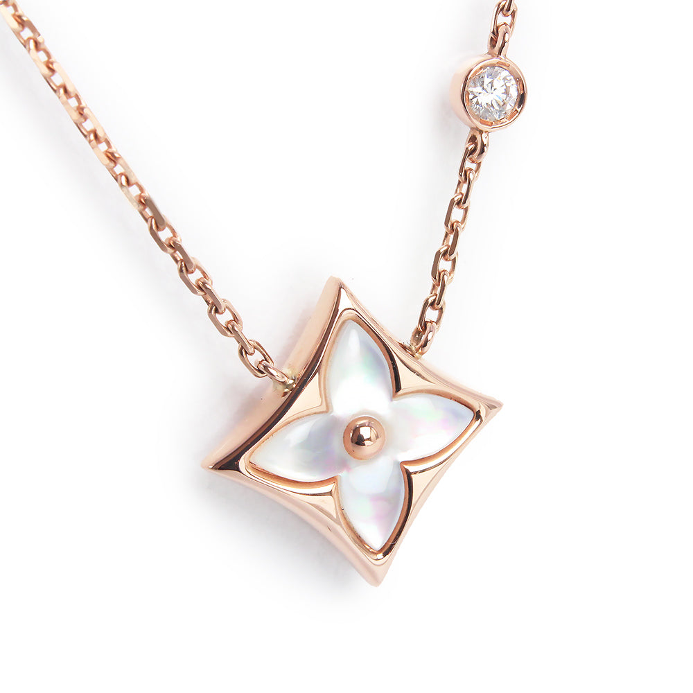 ルイヴィトンの「ペンダント ブロッサム BB」。フラワー型に彫刻された小ぶりなhowaitoホワイト マザー・オブ・パールに組み合わされたピンクゴールドが、ダイヤモンドによって美しく際立ちます。