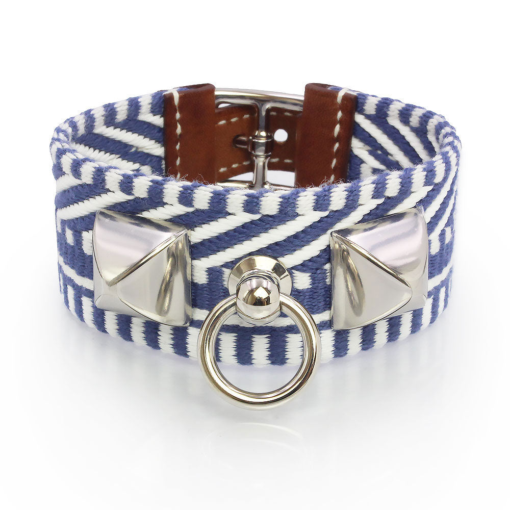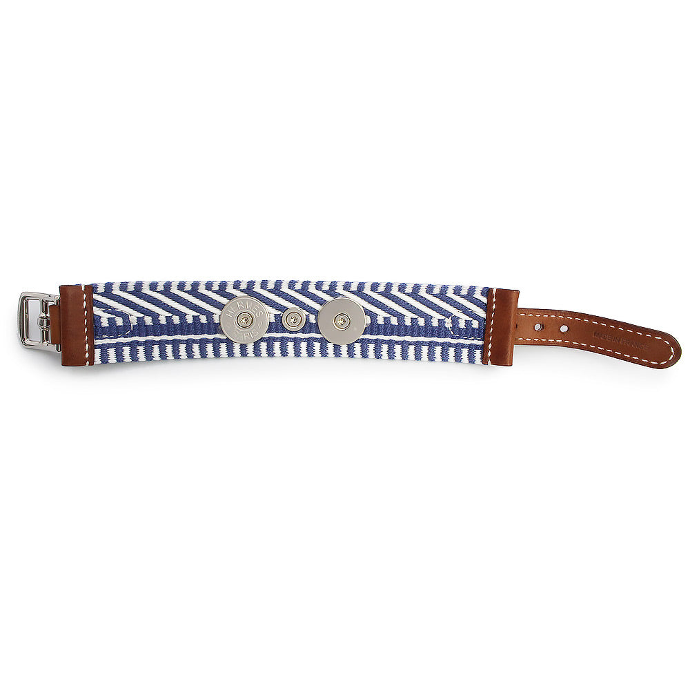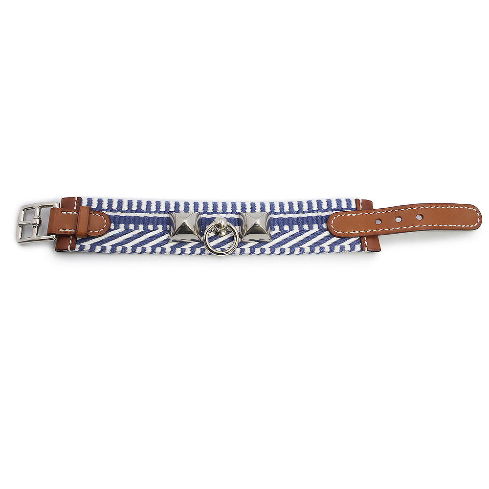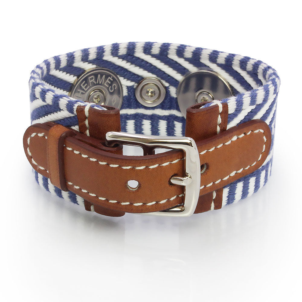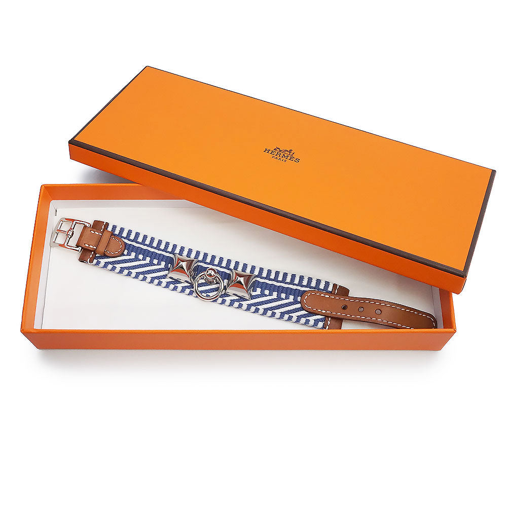 【新品・未使用品】HERMES エルメス リヴァル カヴァル メドール サングル キャンバス ヴォーバレニア ブルーブライトン ホワイト ブラウン C刻印 ブレスレット #T2 レザー シルバー金具 箱付