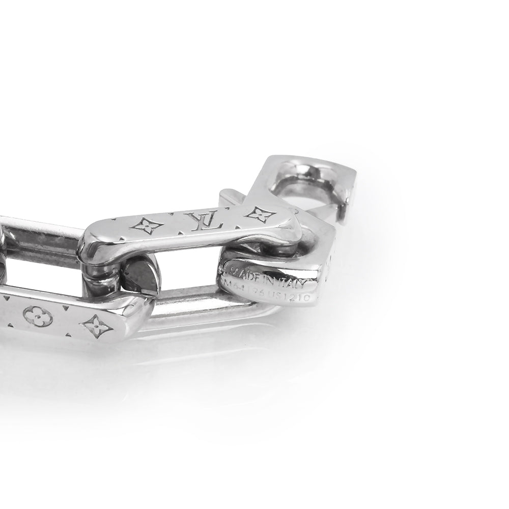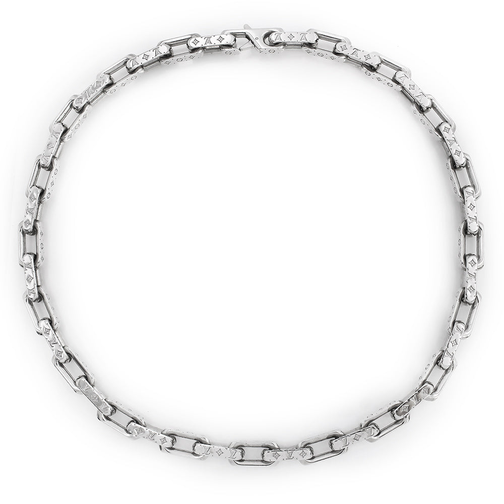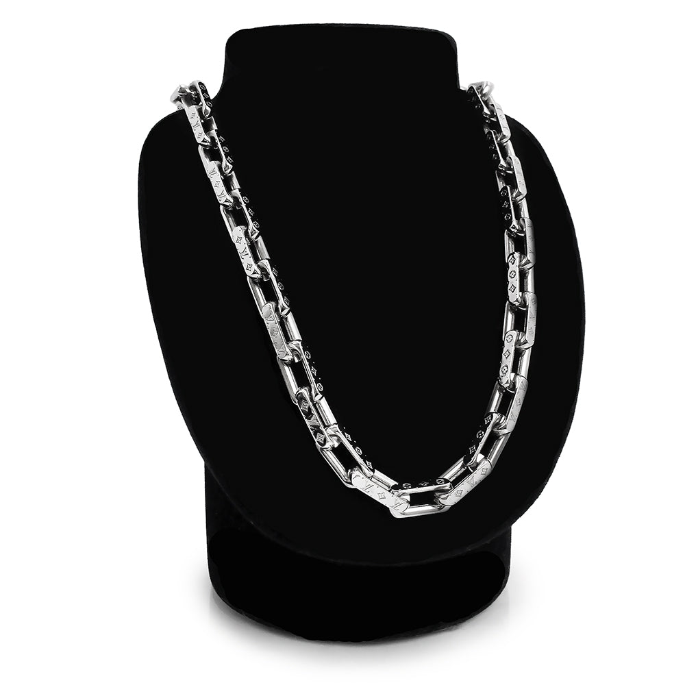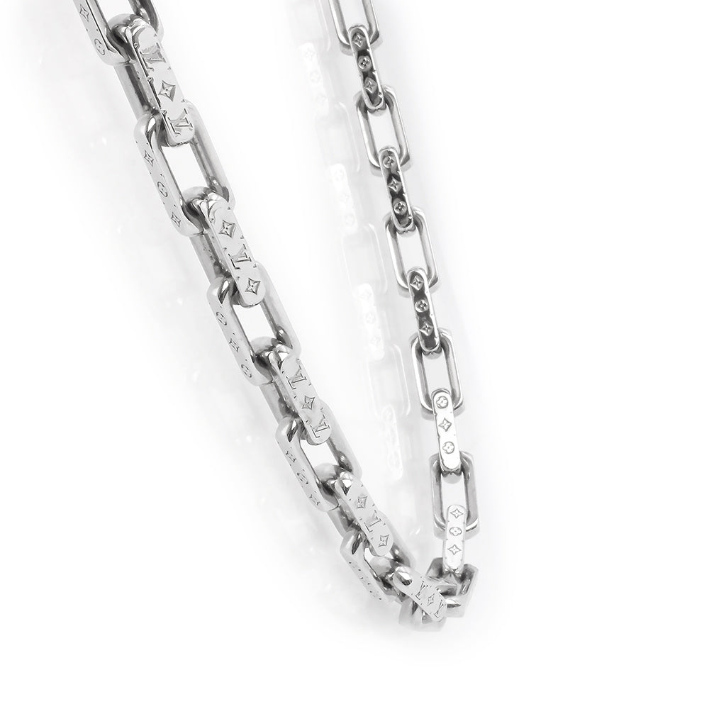 シグネチャーのモチーフを精巧に刻印した、アイコニックな「コリエ・チェーン モノグラム」。シルバーカラーのメタルで象ったチェーンに、ルイ・ヴィトンを象徴するモノグラム・パターンデザインのネックレスです。 |