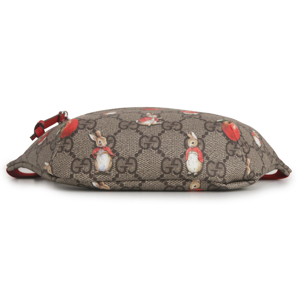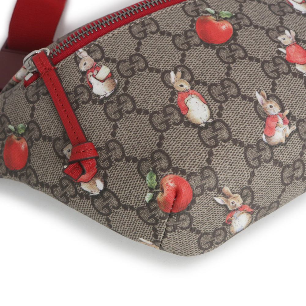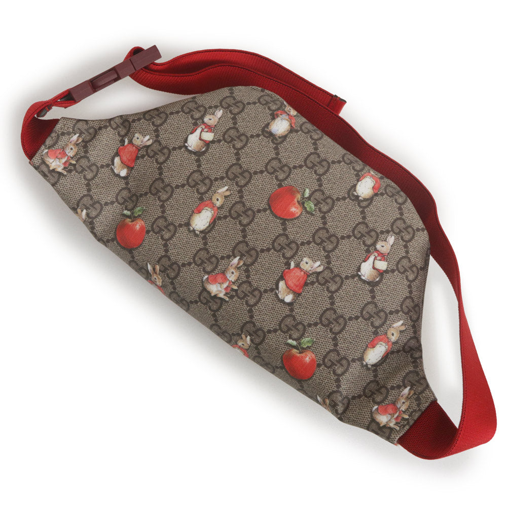 GGスプリームキャンバスに、絵本『ピーターラビット』に登場するウサギとリンゴのプリントがあしらわれたキッズ向けのベルトバッグです。大人も着用できるサイズで、ウエストバッグまたはクロスボディバッグとして使用できます。