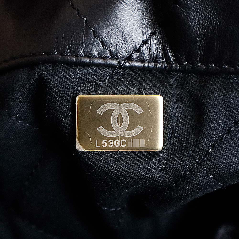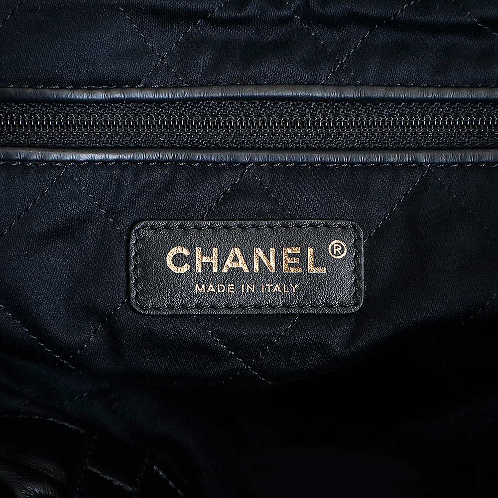 手触りの滑らかなラムスキンを使用したCHANEL 22のリュックです。手持ちがついているので、床にリュックを置かなくても中の荷物の確認ができ便利な作りとなっています。ショルダーチェーンに使用されているココマークと、バッグ前面のブランドロゴが印象的です。 |