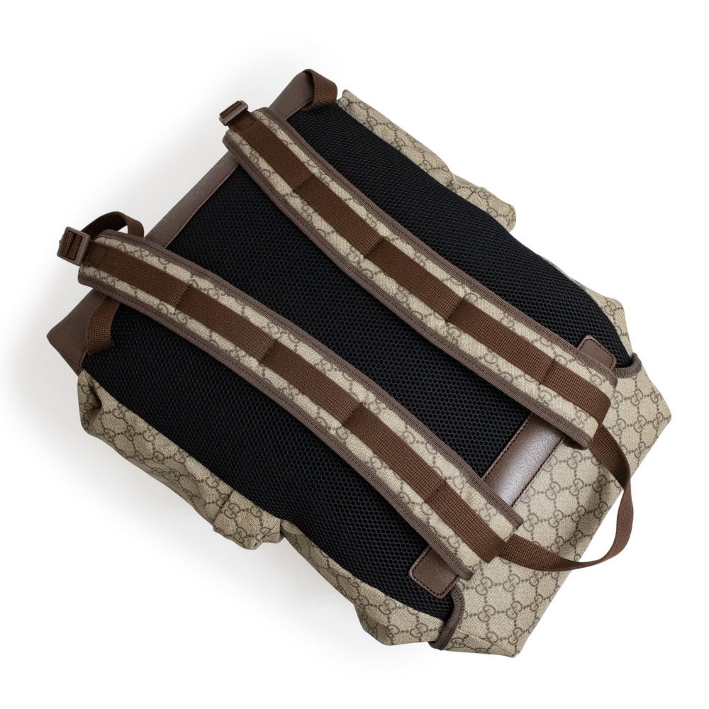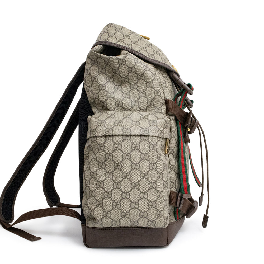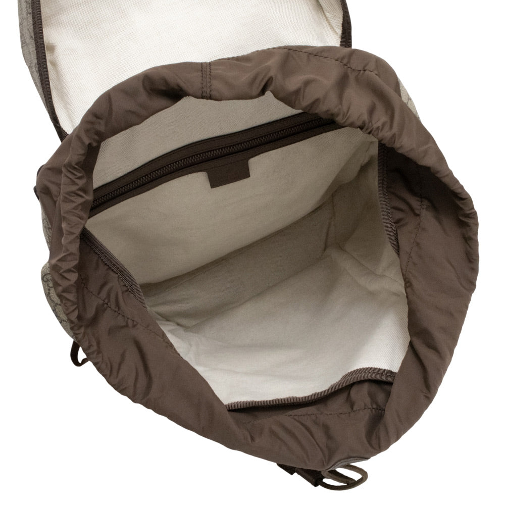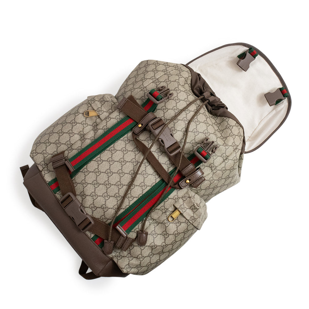 GGスプリームキャンバスにウェブストライプがグッチらしいバックパック。大容量で、フラップの内側はドローストリングス開閉なので出し入れもしやすく、正面にはスケートボードが収納できるストラップ付です。 |