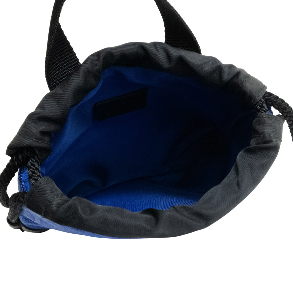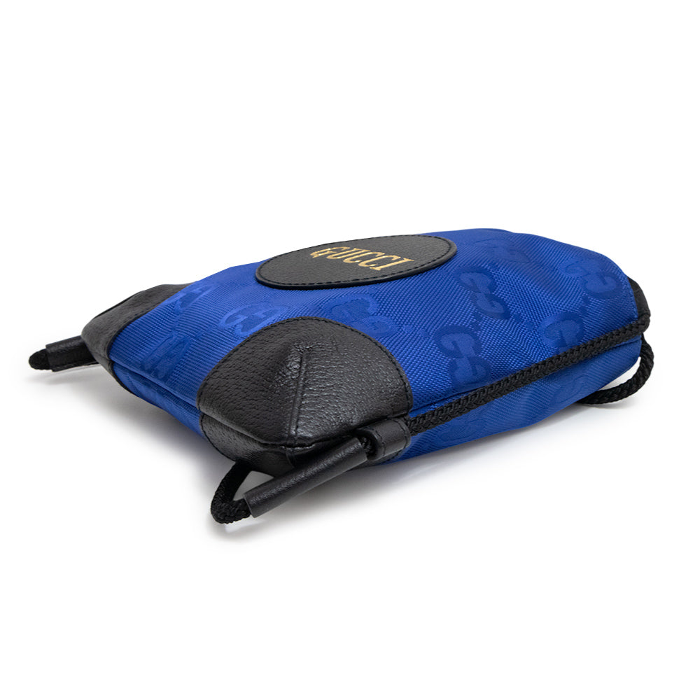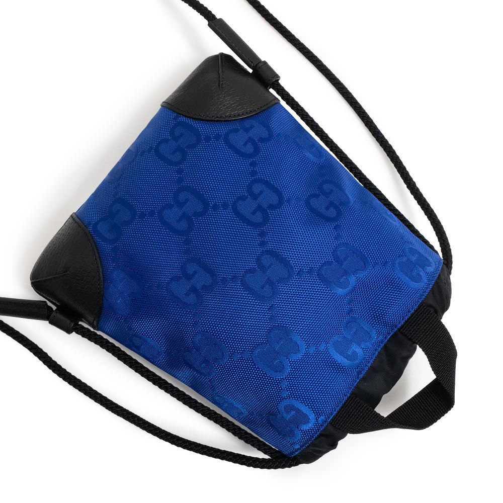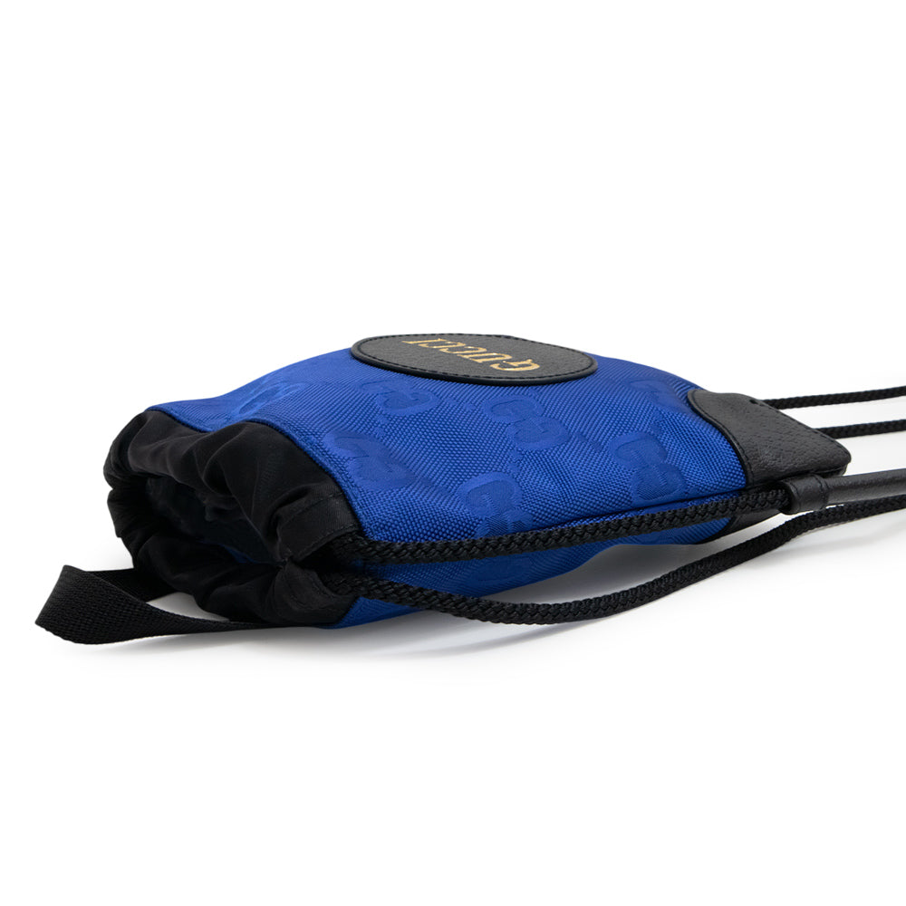 グッチのサステナビリティに対する取り組みの一環として、リサイクル素材を採用したアクセサリー&ウェア コレクション「グッチ オフ ザ グリッド」。鮮やかなブルーのベースにGGパターンを描き出した生地と環境に配慮した素材が使用されています。出し入れがしやすいドローストリング開閉です。 |