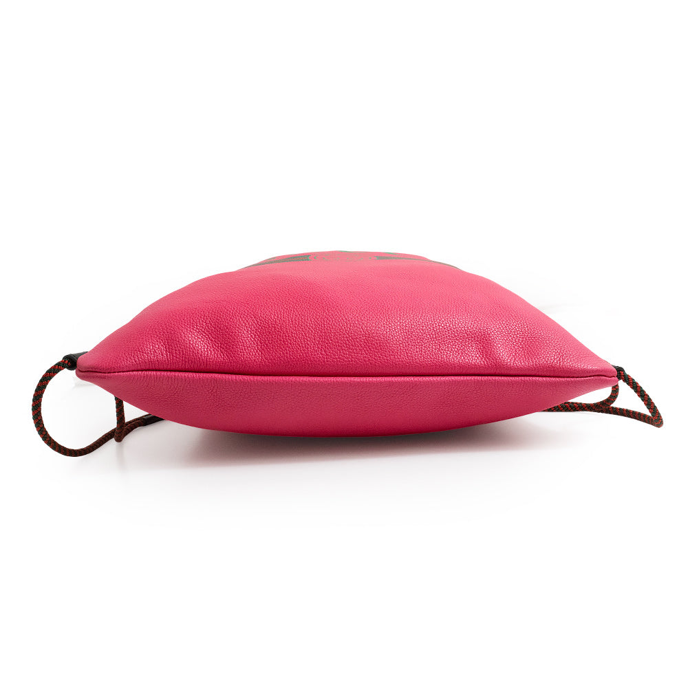 カーフレザーに80年代のヴィンテージプリントからインスピレーションを得た、ロゴがあしらわれた「ドローストリング バックパック」。 すっきりとしたフォルムと高い収納力を持つ、リュックタイプのデイパックです。