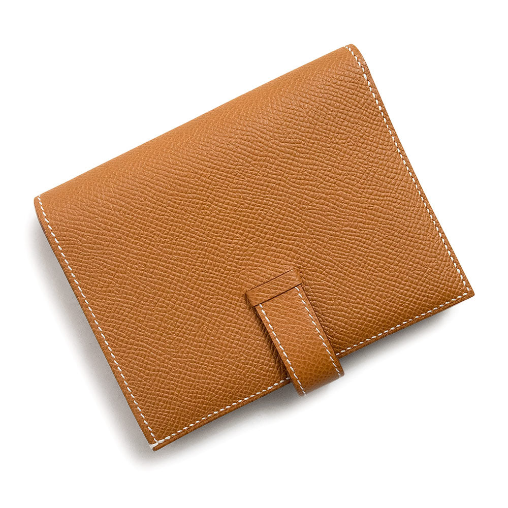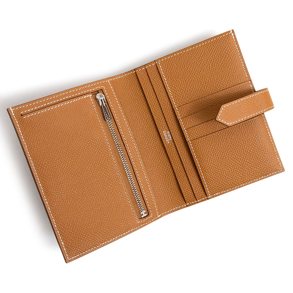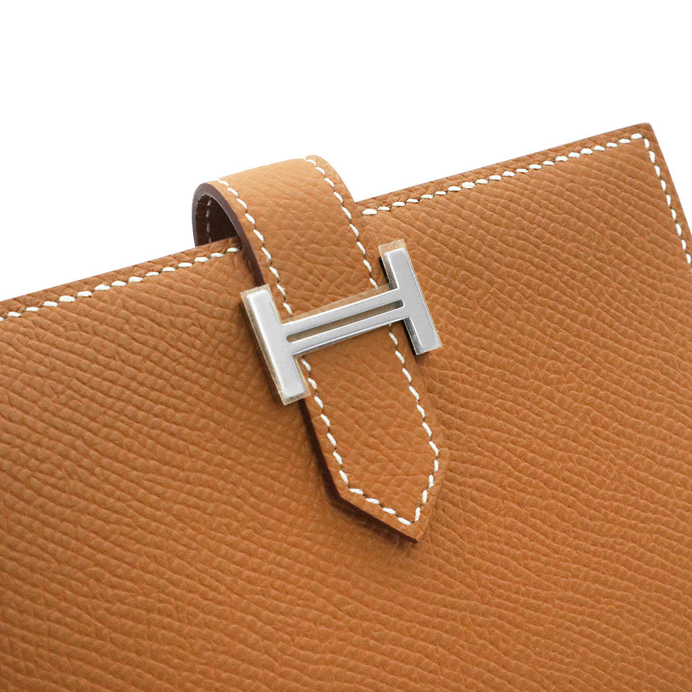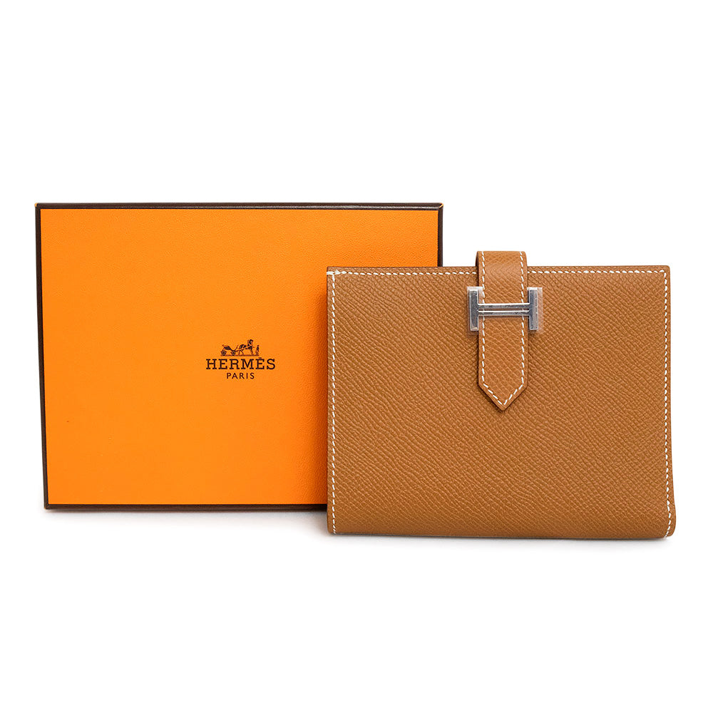 【新品・未使用品】エルメス HERMES ベアン コンパクト 二つ折り財布 ヴォーエプソン レザー ゴールド ブラウン シルバー金具 B刻印 箱付