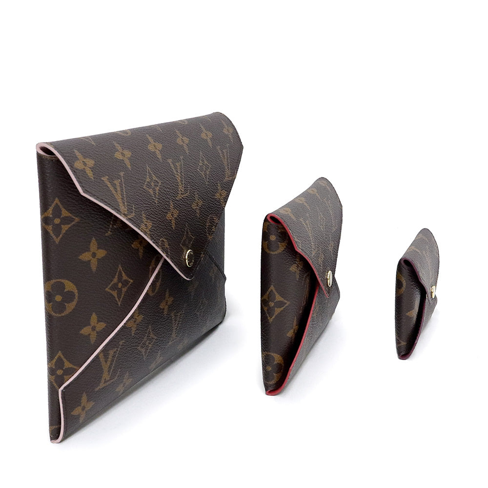3つのエンヴェロップが1つに合わさった「ポシェット・キリガミ」。ロシアの人形 マトリョーシカのような構造は、日用品を持ち運ぶのに最適。大きなポシェットには書類、口紅、小切手帳などの日用品を、ミディアムサイズのポシェットにはパスポートや鍵を、そしてミニサイズのポシェットにはカードやコインを収納できます。 |