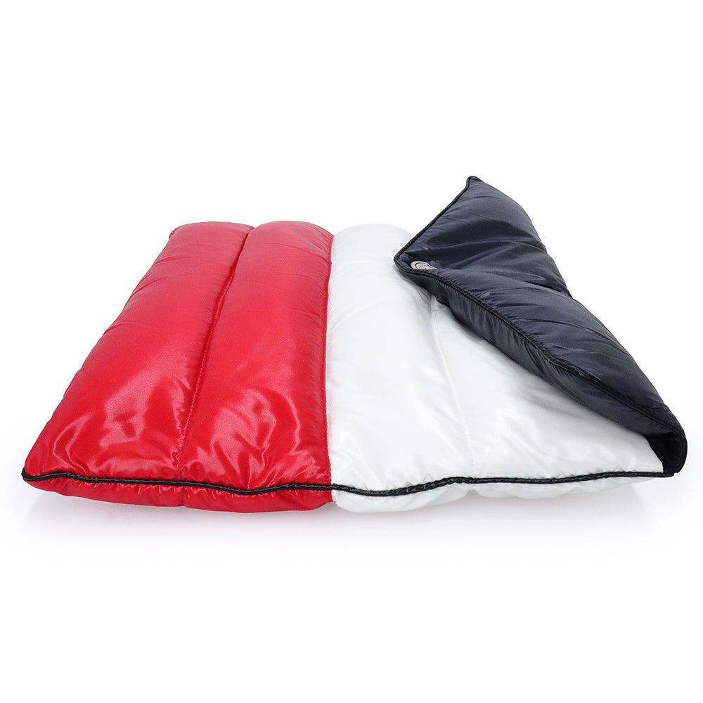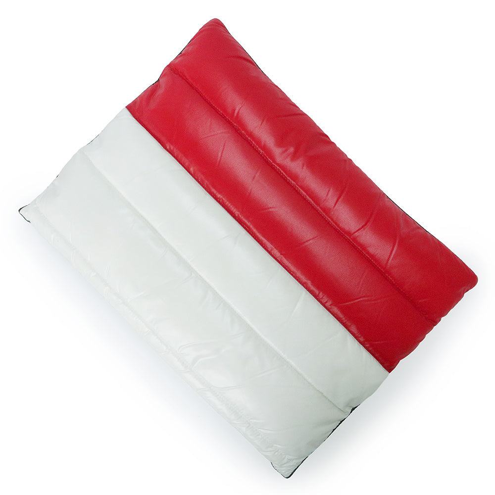 モンクレールのダウン素材のクラッチバッグ。ブランドを象徴するネイビー・レッド・ホワイトのトリコロールカラーを大胆に配したデザインで非常に軽く、ちょっとしたお出かけにぴったりです。 |