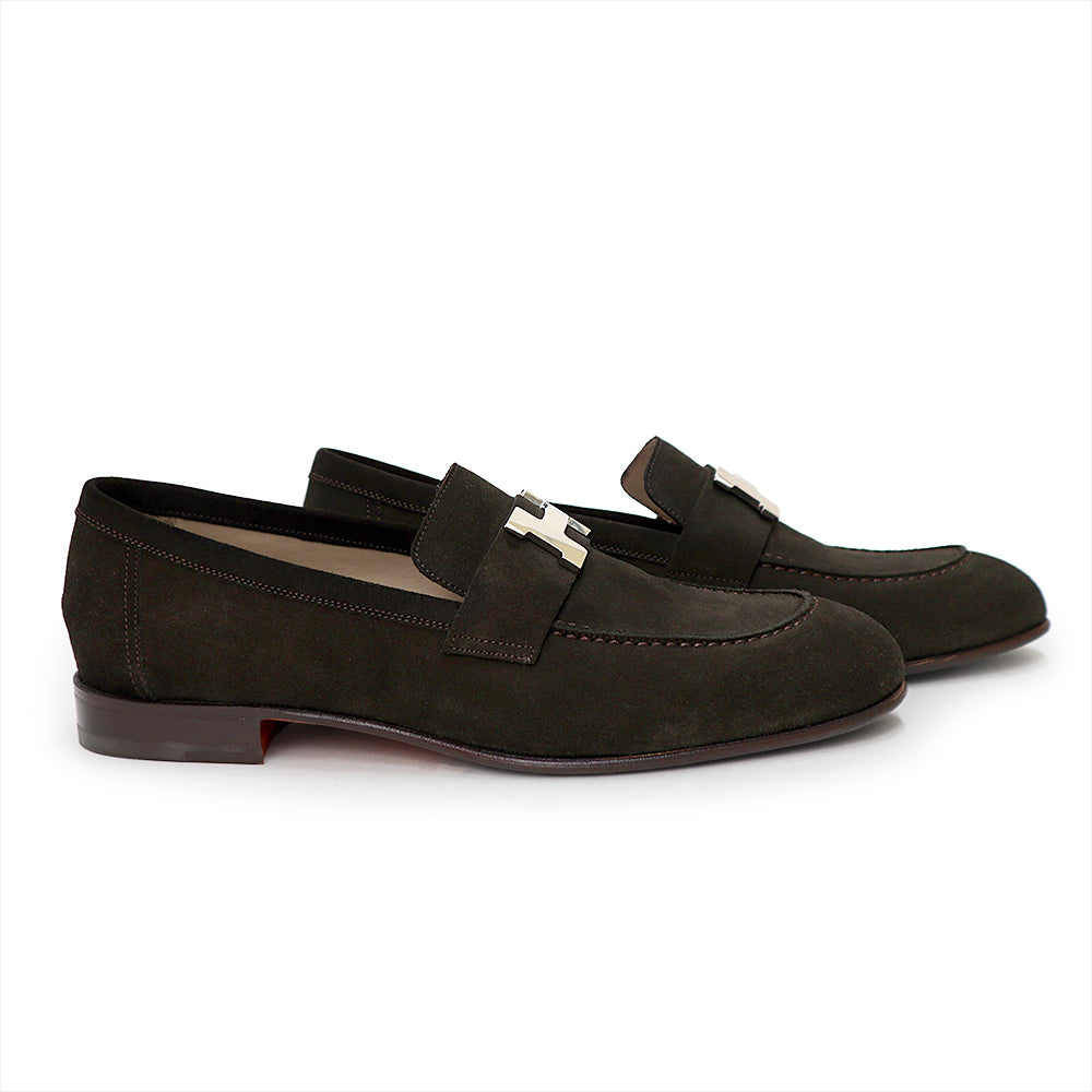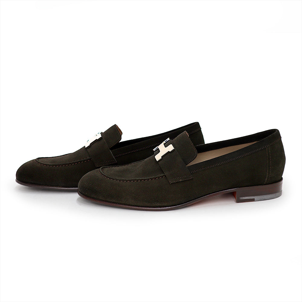 エルメスを代表する定番モデル「パリ ローファー」。フロントに配されたアイコニックなHバックルが洗練された存在感を放つ一足です。素材にはしっとりとした起毛感が魅力のヴォーベロアを使用。上質なダークブラウンカラーが足元に落ち着きと高級感を与え、カジュアルからきれいめスタイルまで幅広く活躍します。