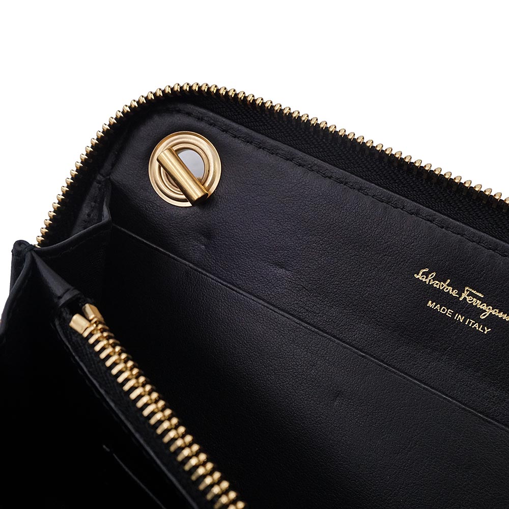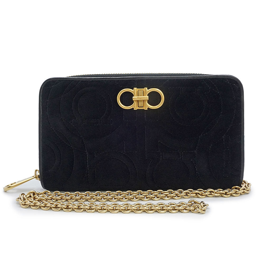 全体がガンチーニモチーフでデザインされたサルヴァトーレ・フェラガモのチェーンウォレット。斜めがけが出来るバッグのようなチェーンタイプで高級感があり、パーティーシーンや、もちろん普段使いにもお使いいただけます。 |