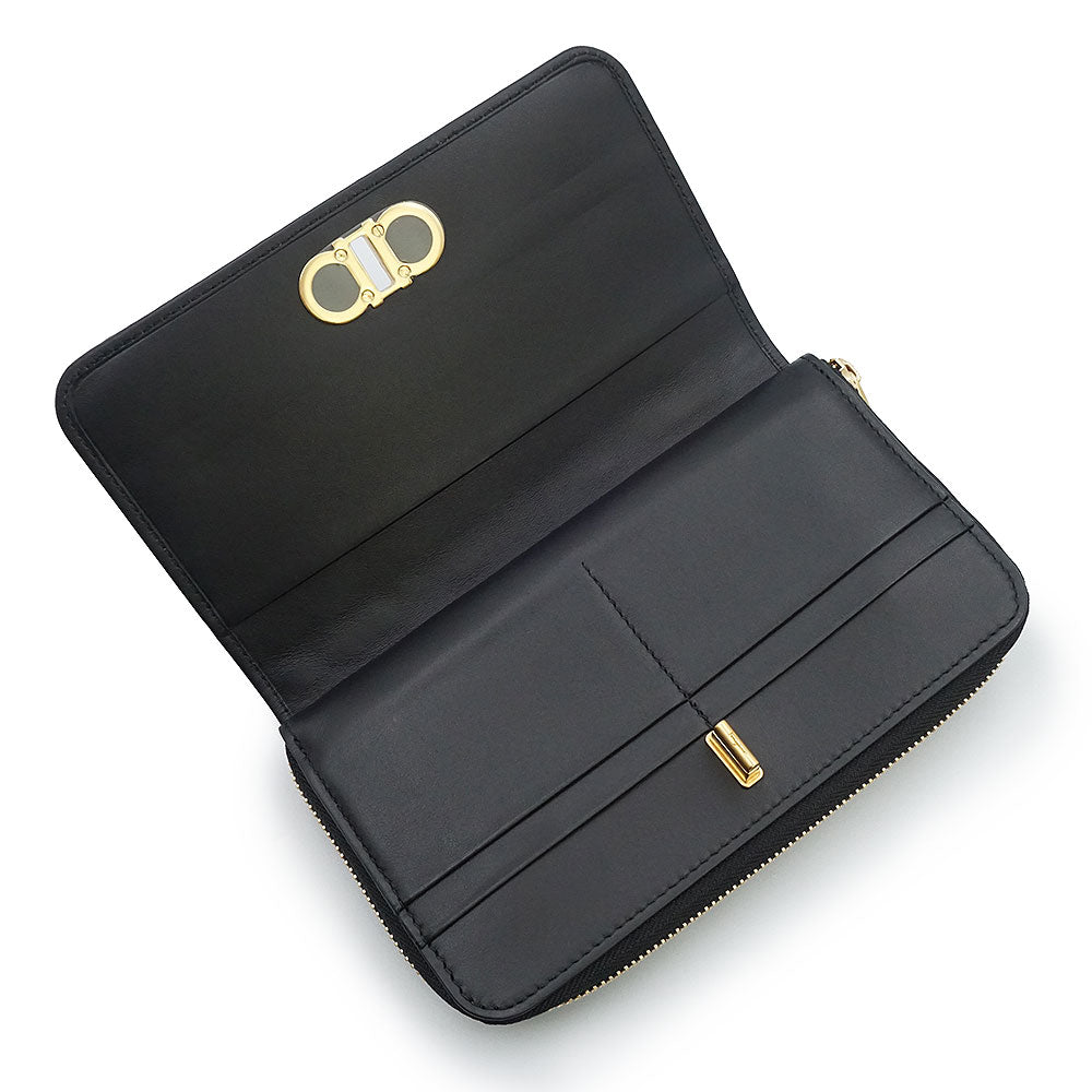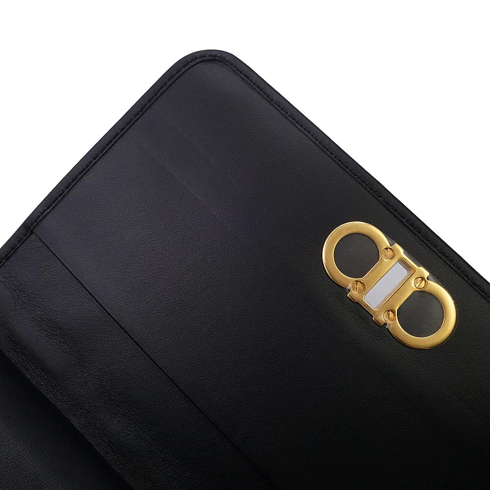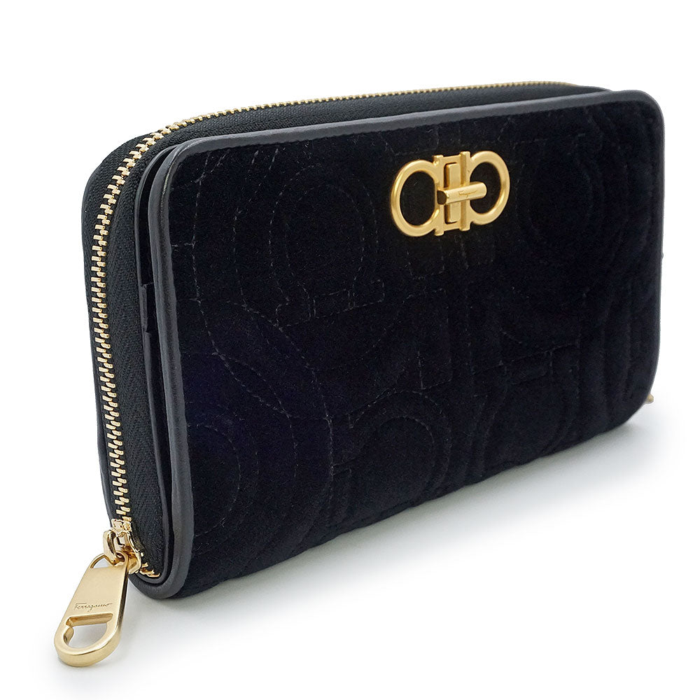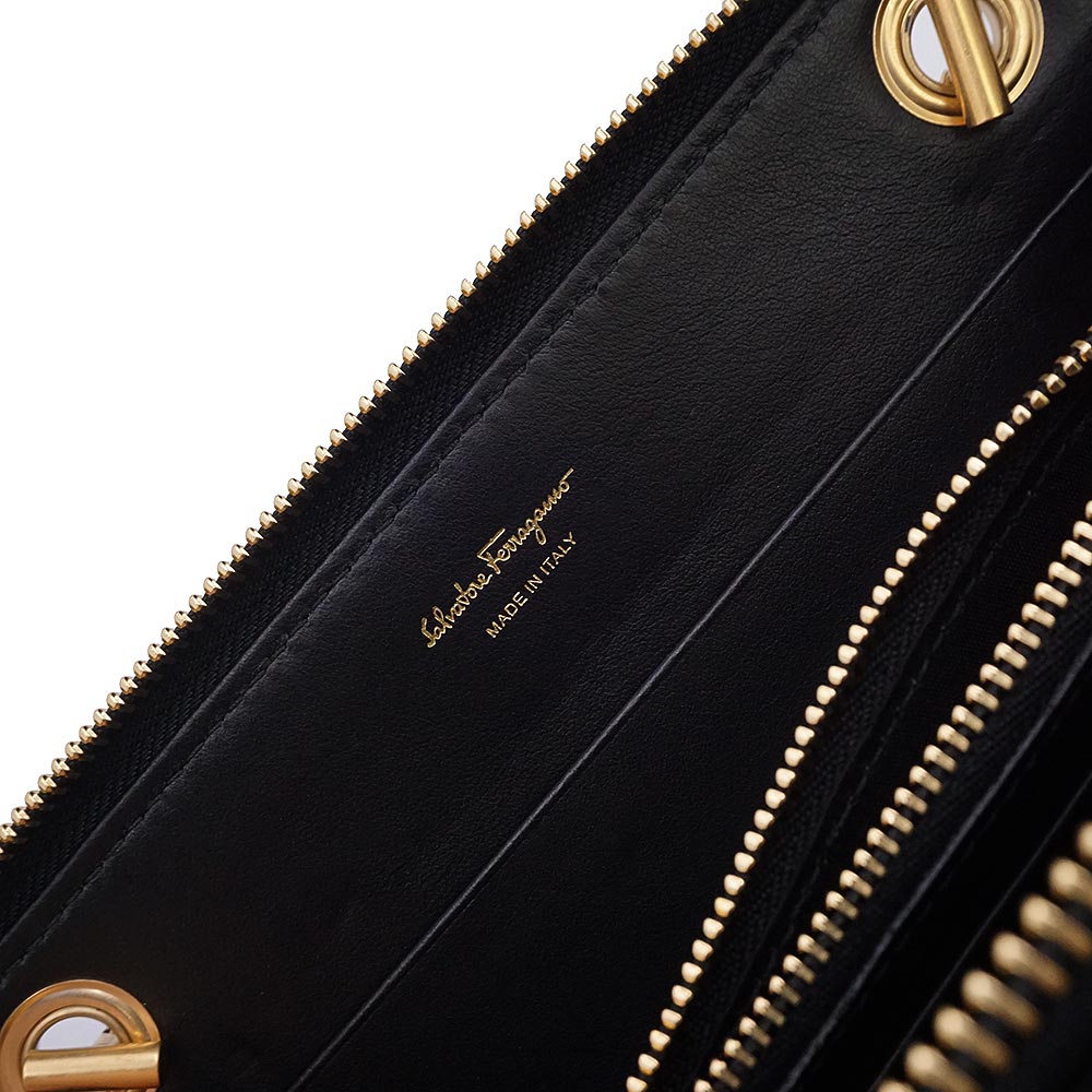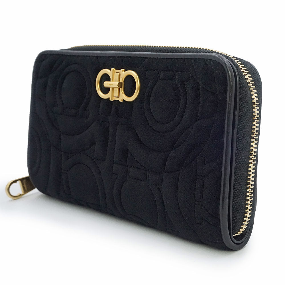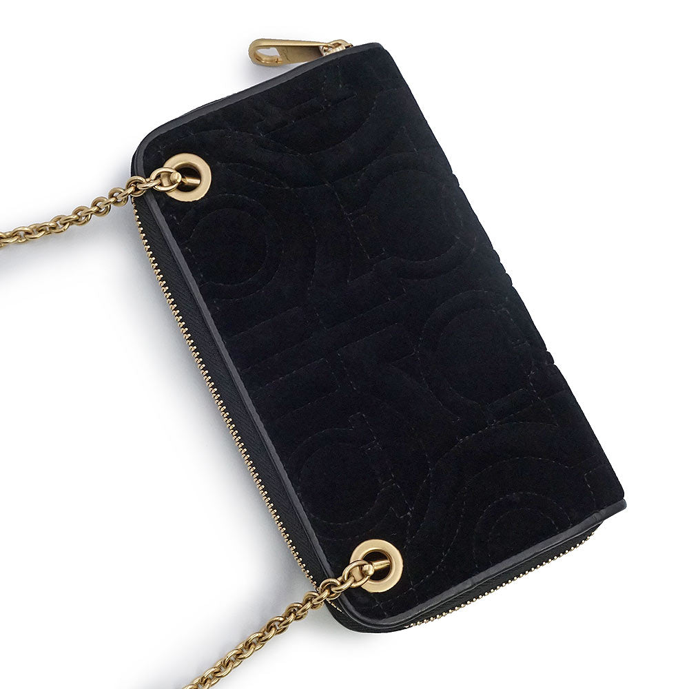 【未使用 展示品】サルヴァトーレフェラガモ Salvatore Ferragamo ガンチーニ キルティング チェーンウォレット 二つ折り長財布 ショルダーバッグ 斜め掛け ベルベット カーフスキン レザー ブラック ゴールド金具 22D332