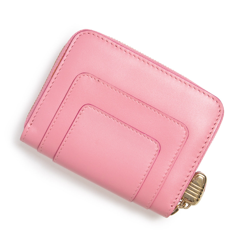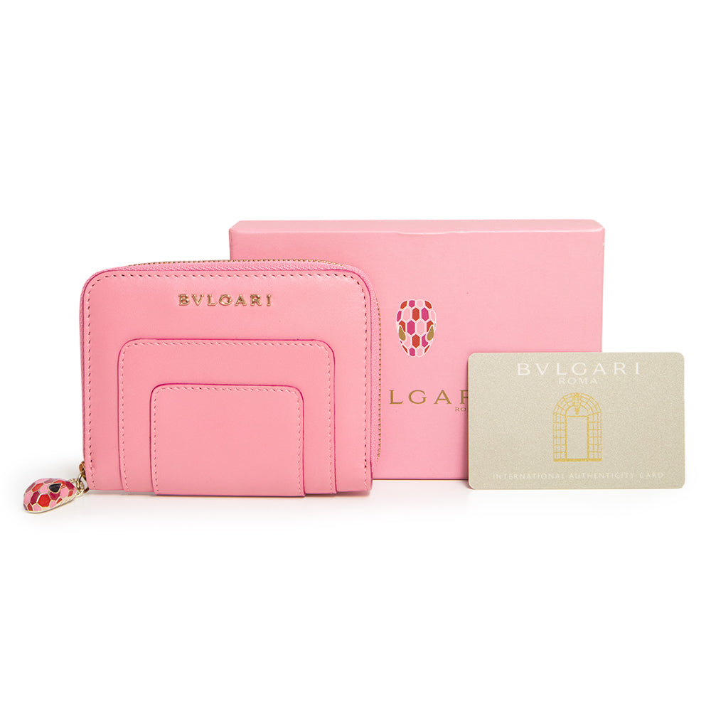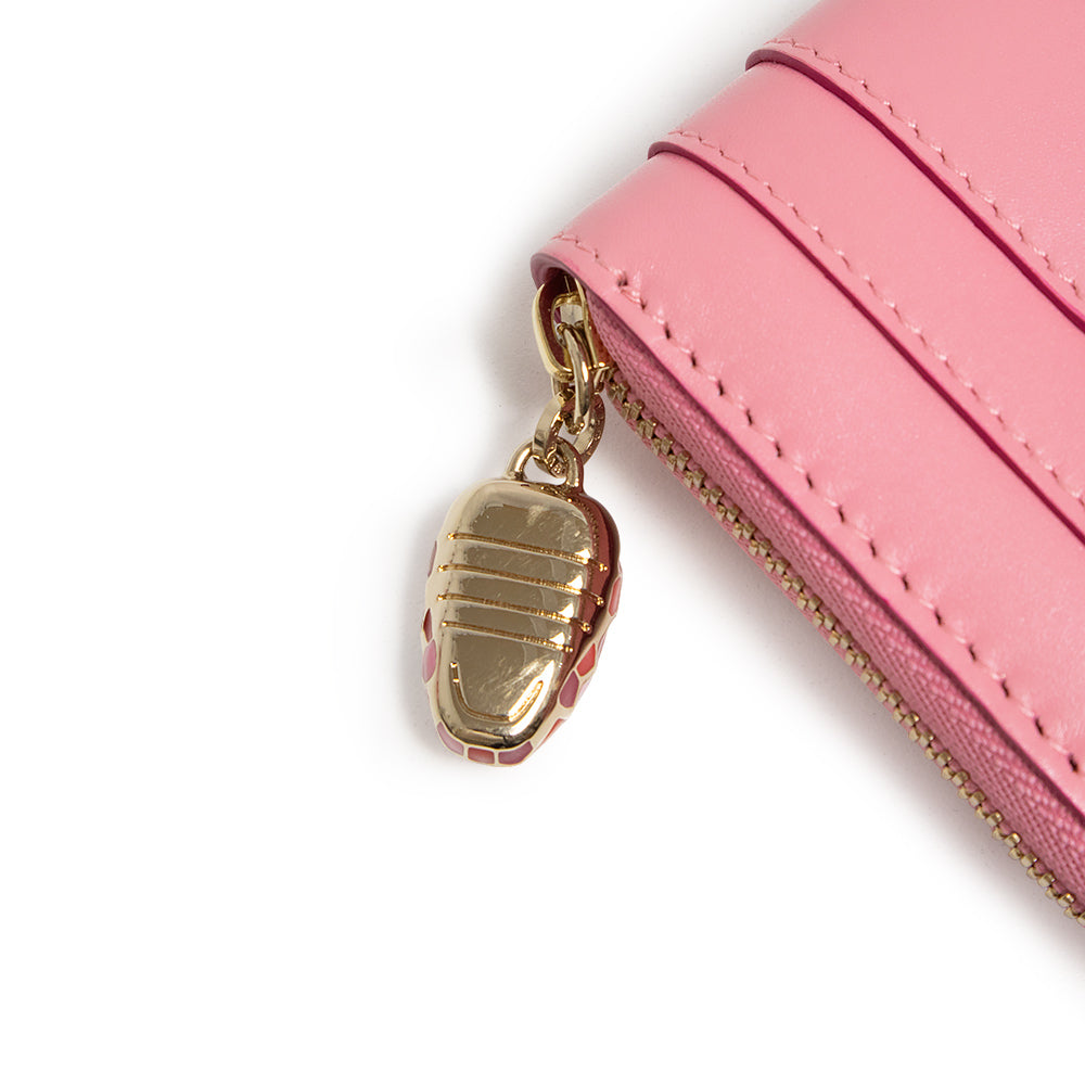 ピンクカラーのカーフスキンレザーにゴールドトーンのメタル装飾が施された、ブルガリ セルペンティ フォーエバー ジップウォレット。コンパクトなサイズで、実用性とエレガントさを兼ね備えたアイテムです。