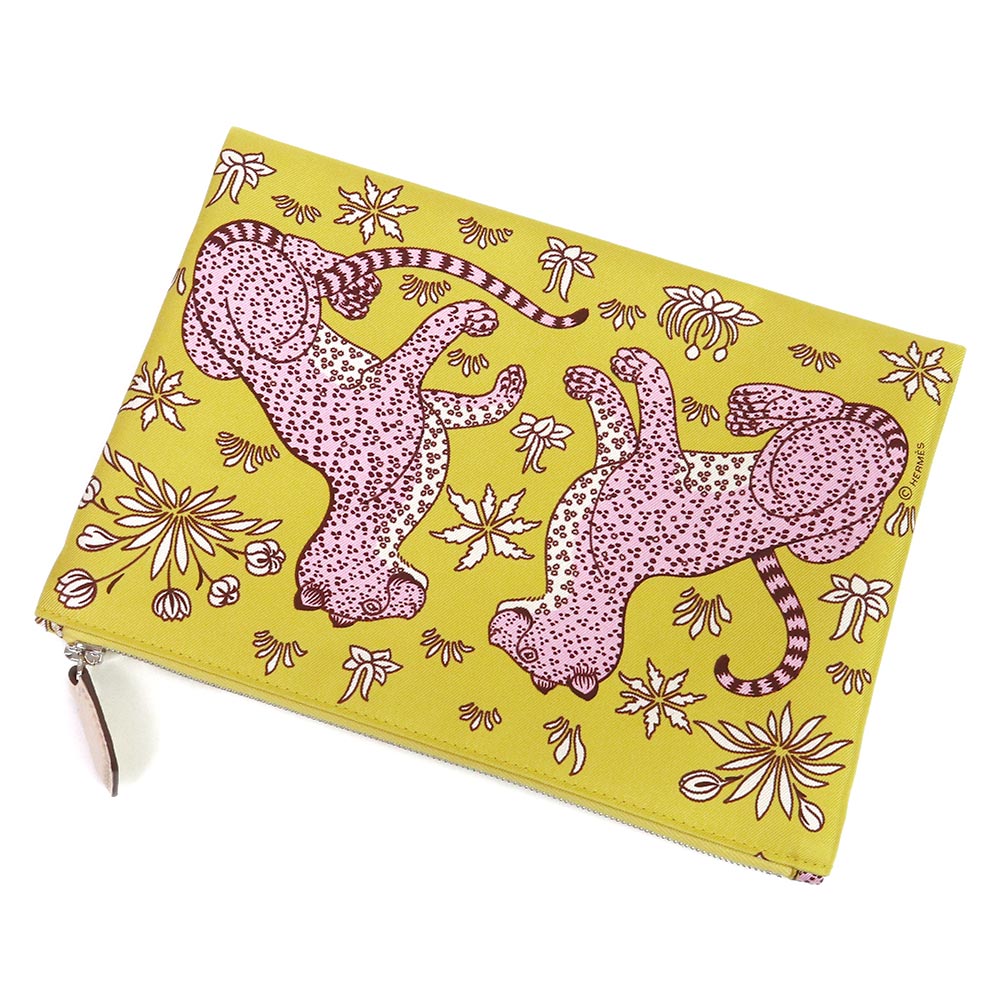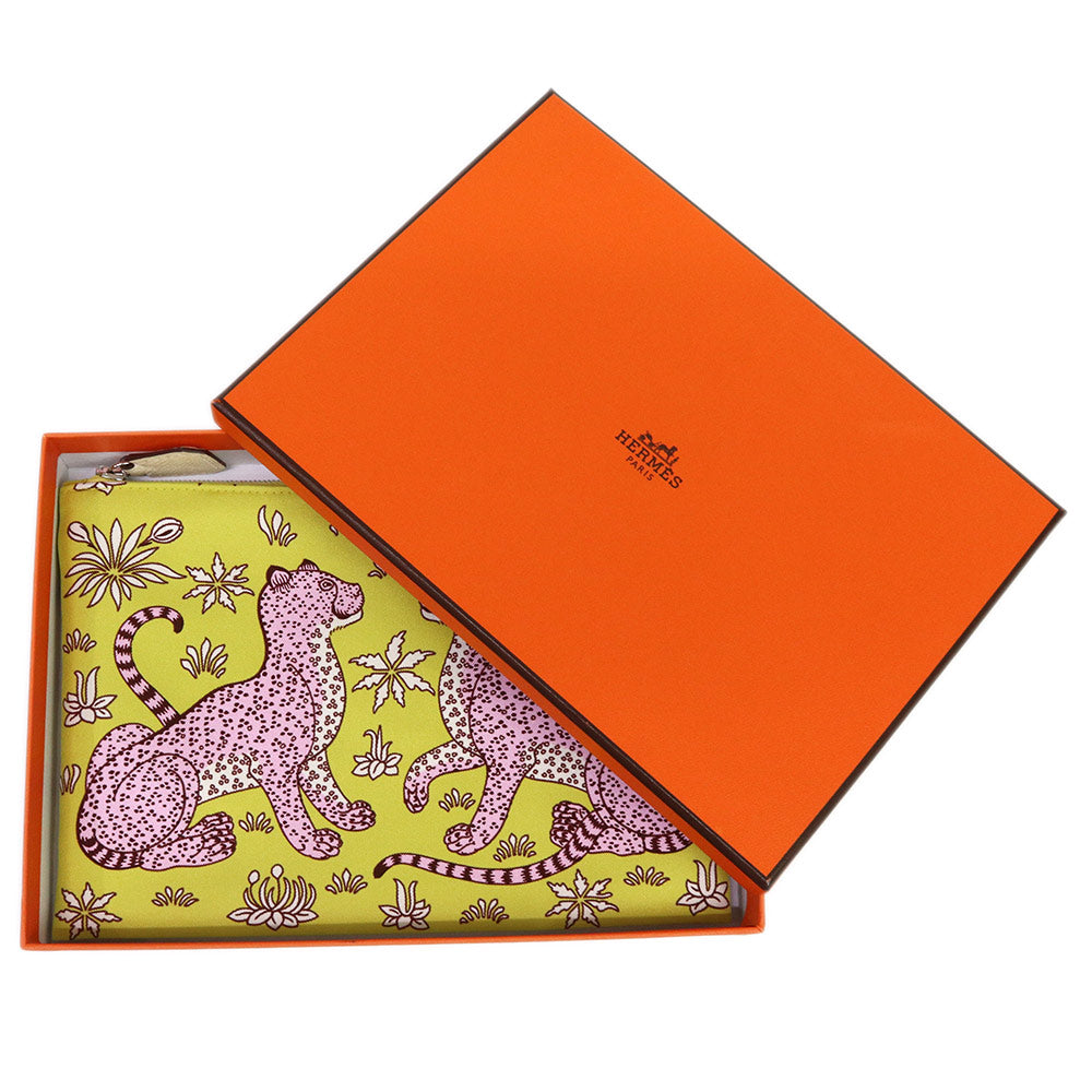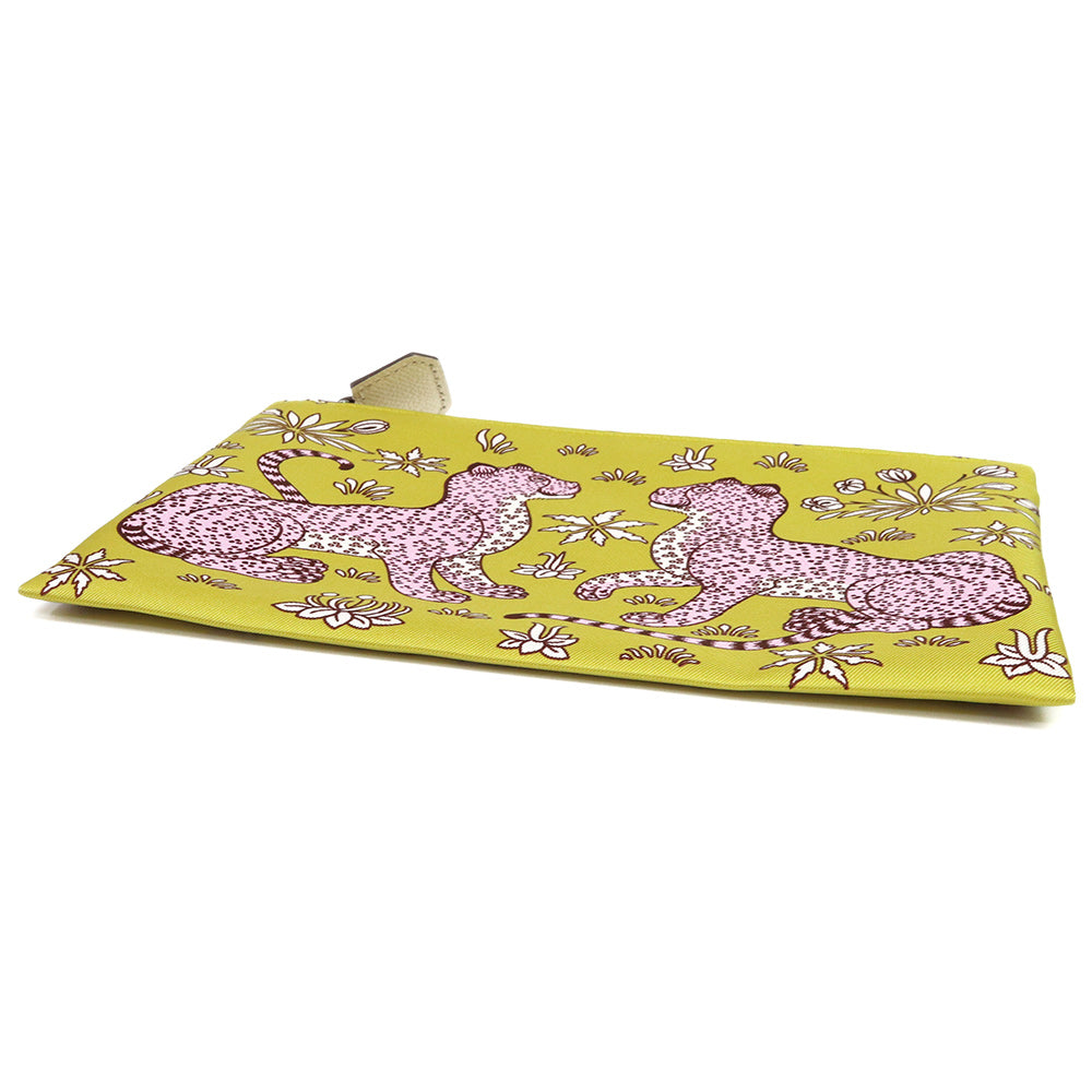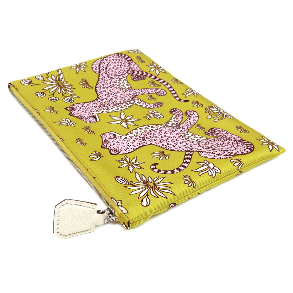 【未使用保管品】HERMES エルメス シルキーポケット ポーチ レオパード LES LEOPARDS コスメ 化粧 フラット ポーチ シルク100% ヴォーエプソン ジョーヌシトロン モーヴペール ナタ イエロー レザー シルバー金具 U刻印 箱付