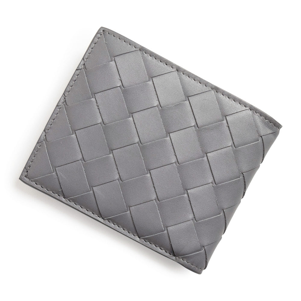 ボッテガの定番のイントレチャート二つ折りウォレット。カード入れが4つと、お札用コンパートメント、コイン用ポケットと収納力も抜群。内側にはブランドロゴの刻印があしらわれています。 |